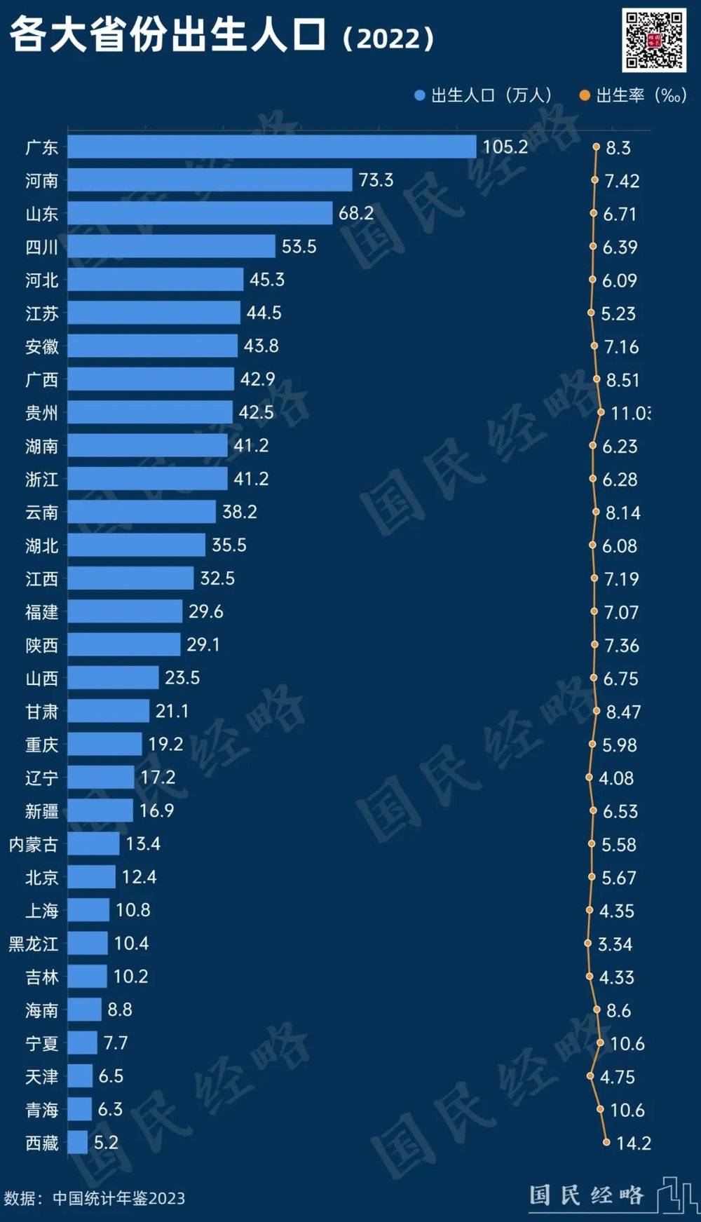与之对比,同为全国TOP5人口大省的山东、河南、江苏、四川,2022年出生人口分别为68.2万、73.3万、44.5万、53.5万。