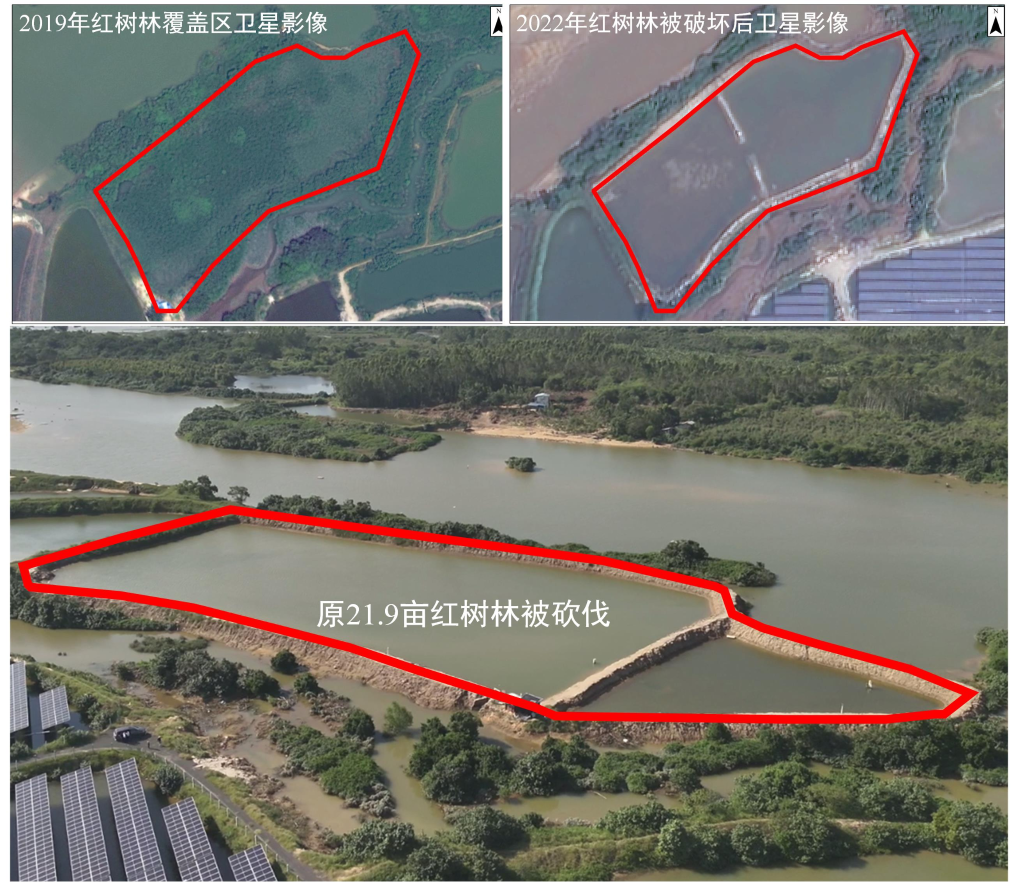 2023年11月23日,督察组现场督察使用无人机拍摄,儋州市光村镇位于生态保护红线内21.9亩红树林被陆续砍伐。(督察组供图)