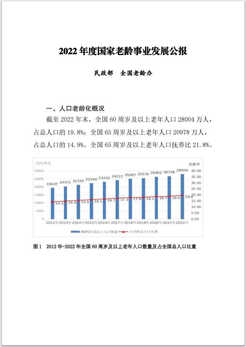 民政部公布《2022年度国家老龄事业发展公报》,截至2022年末,全国60周岁及以上老年人口28004万人,占总人口的19.8%;全国65周岁及以上老年人口20978万人,占总人口的14.9%。全国65周岁及以上老年人口抚养比21.8%。