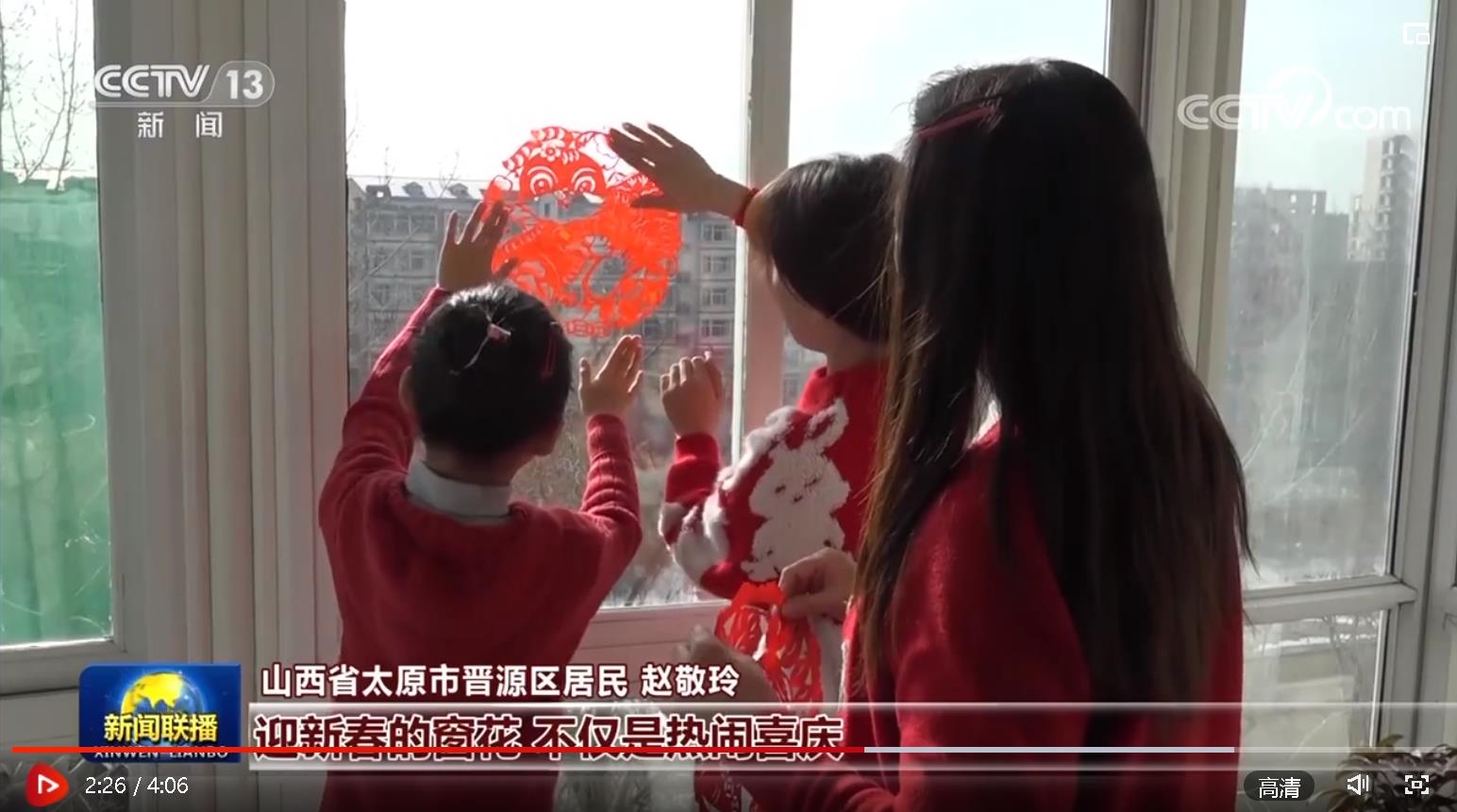 “在山西太原,‘五福临门’‘玉兔迎春’等主题丰富的窗花,让节日气氛越发浓厚。”《新闻联播》在《张灯结彩庆新春 喜庆祥和中国年》报道中,展示了太原市民剪窗花迎新春的喜悦。晋源区居民赵敬玲说:“迎新春的窗花,不仅仅是热闹喜庆,也寄托了我们对新春的祝愿。”