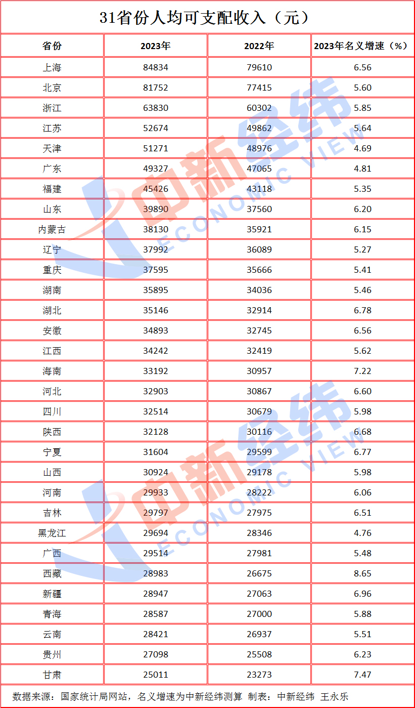 中新经纬1月20日电 (王永乐)2023年31省份人均收入榜出炉。国家统计局19日公布的2023年居民人均可支配收入数据显示,上海、北京、浙江稳居前三,上海和北京更是携手首超8万元;西藏名义增速最高。你家乡排第几?