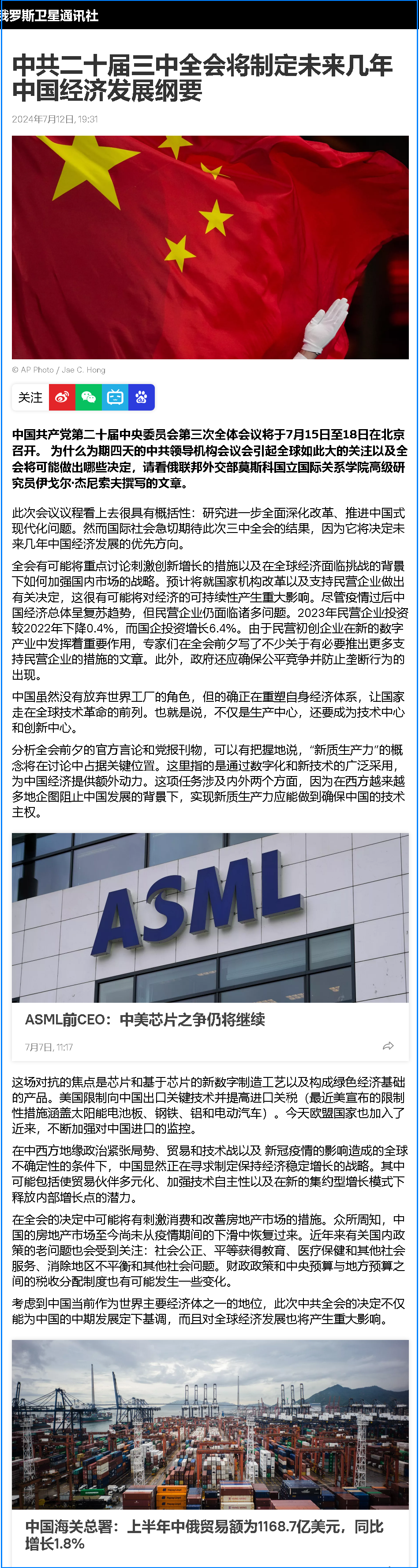 全会有可能将重点讨论刺激创新增长的措施以及在全球经济面临挑战的背景下如何加强国内市场的战略。预计将就国家机构改革以及支持民营企业做出有关决定,这很有可能将对经济的可持续性产生重大影响。尽管疫情过后中国经济总体呈复苏趋势,但民营企业仍面临诸多问题。2023年民营企业投资较2022年下降0.4%,而国企投资增长6.4%。由于民营初创企业在新的数字产业中发挥着重要作用,专家们在全会前夕写了不少关于有必要推出更多支持民营企业的措施的文章。此外,政府还应确保公平竞争并防止垄断行为的出现。