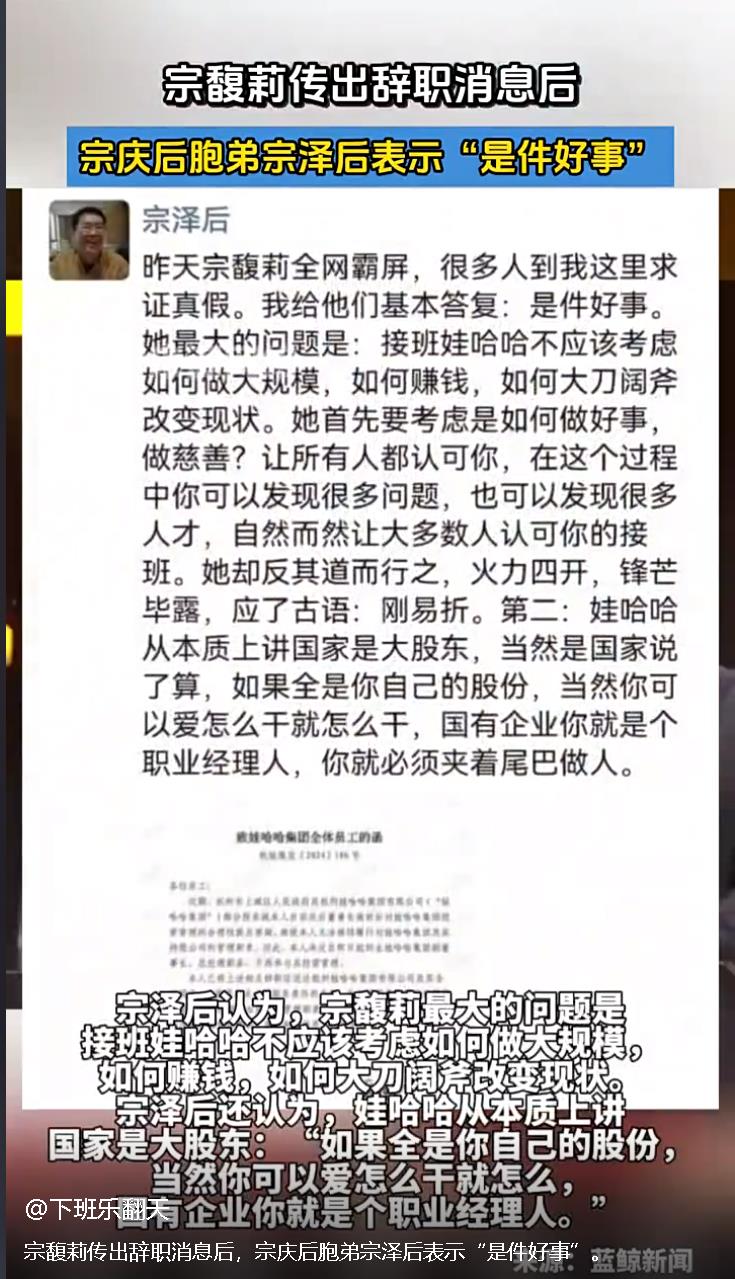 这或许一定程度上解释了,宗庆后胞弟宗泽后为何会在朋友圈公开表示,宗馥莉辞职“是件好事”。