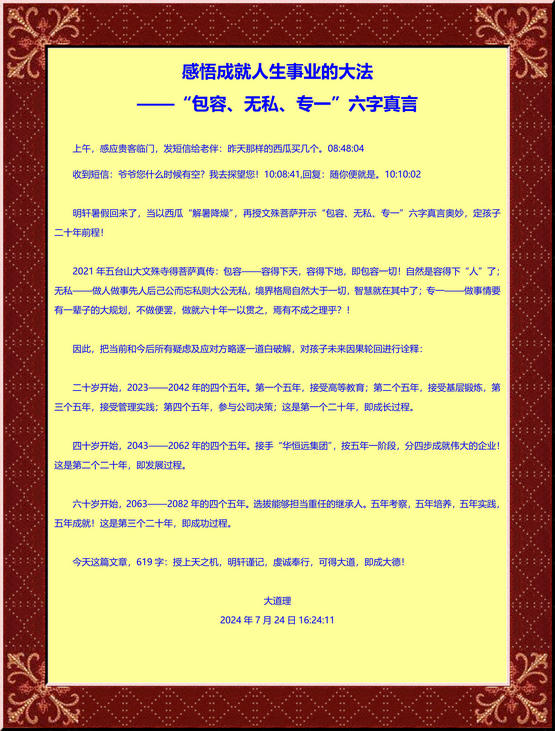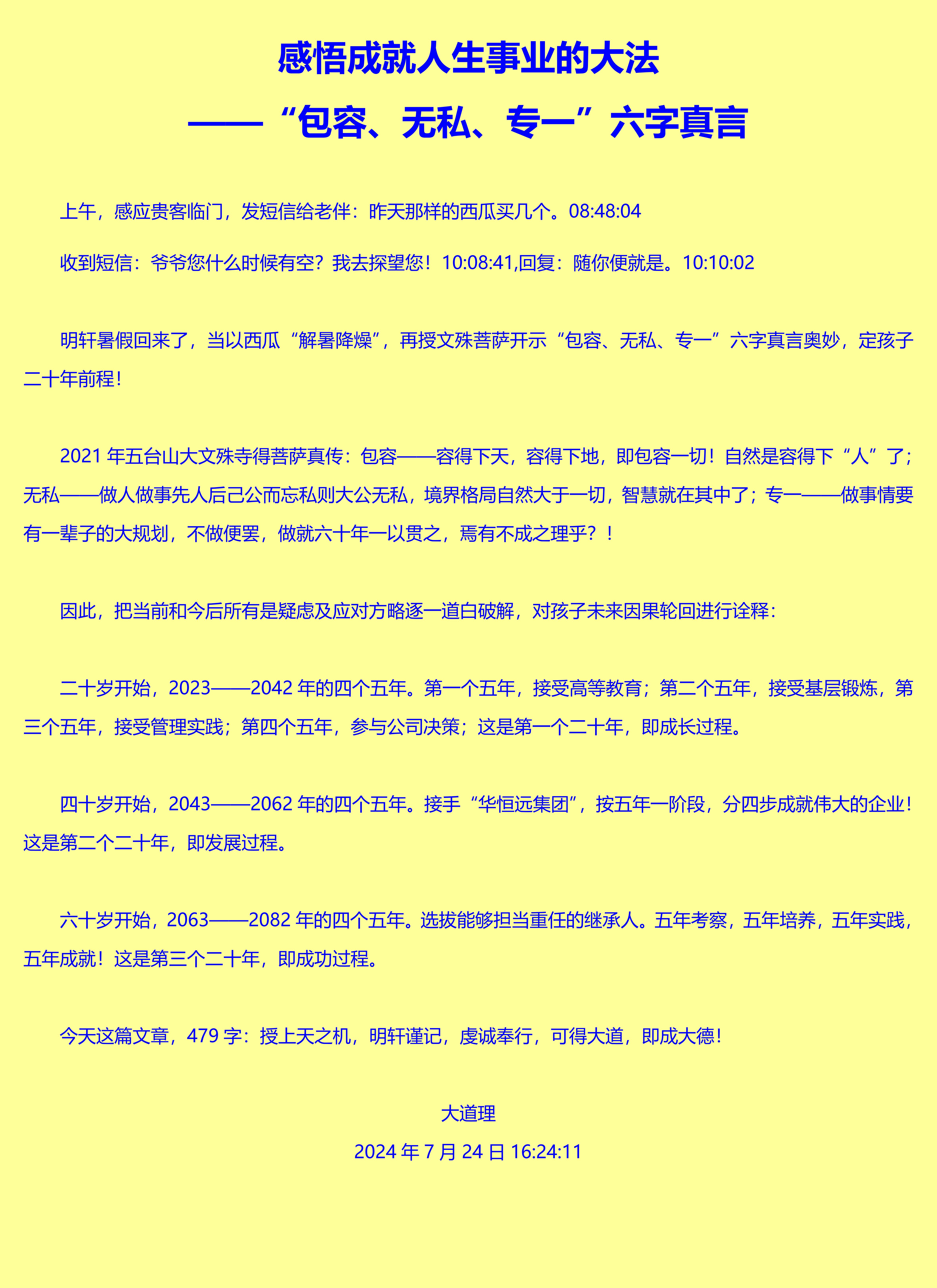 今天这篇文章,479字:授上天之机,明轩谨记,虔诚奉行,可得大道,即成大德!