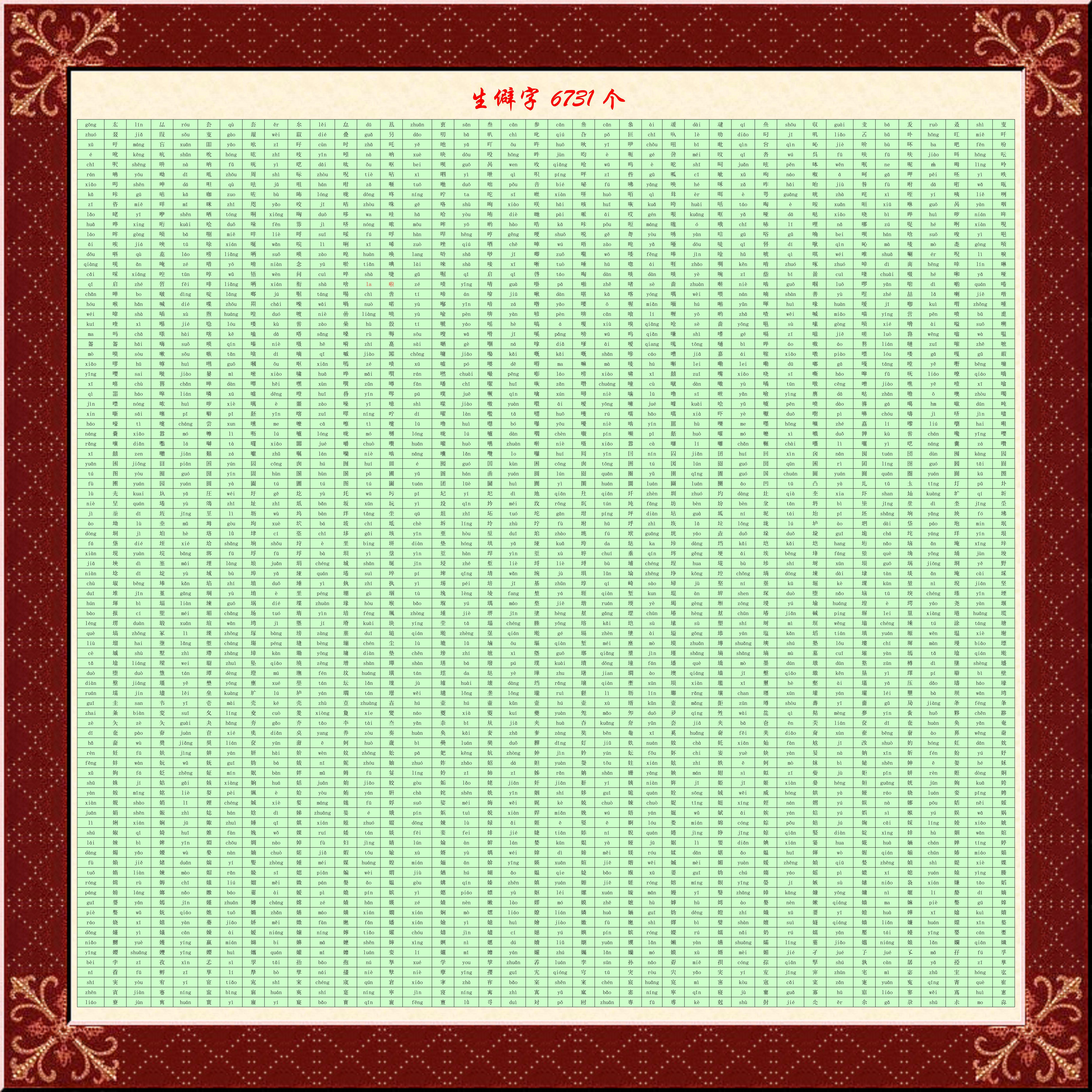 1. 爩 yù2. 灪 yù3. 爨 cuàn4. 爧 líng5. 囖 lo6. 欟 guang7. 灨 gàn8. 灧 yàn9. 灥 xún10. 犫 chōu11. 灎 yàn12. 灦 xiǎn13. 圞 luán14. 氎 dié15. 欜 náng16. 斸 zhǔ17. 灢 nǎng18. 爥 zhú19. 爦 lǎn20. 戆 gàng21. 戅 gàng22. 犪 kuí23. 曯 zhú24. 囔 nāng25. 欚 lǐ26. 欘 zhú27. 欝 yù28. 欙 léi29. 欛 bà30. 攮 nǎng31. 孎 zhú32. 灟 zhú33. 灞 bà34. 灠 lǎn35. 爣 tǎng36. 爤 làn37. 斖 wěi38. 巙 kuí39. 囕 lǎn40. 曭 tǎng41. 欔 jué42. 欓 dǎng43. 欗 lán44. 攭 lì45. 囍 xǐ46. 囍 xǐ47. 孏 lǎn48. 彏 jué49. 戄 jué50. 戃 tǎng51. 灜 ying52. 灚 jiǎo53. 灛 chǎn54. 灙 dǎng55. 灡 lán56. 爢 mí57. 灓 luán58. 曫 luán59. 玃 jué60. 巚 yǎn61. 巘 yǎn62. 囐 zá63. 壨 léi64. 曪 luǒ65. 曮 yǎn66. 囒 lán67. 奲 duǒ68. 欑 cuán69. 欕 yan70. 欐 lì71. 戁 nǎn72. 囏 jiān73. 毊 xiāo74. 攨 wā75. 攥 zuàn76. 攫 jué77. 攩 dǎng78. 孊 mǐ79. 孊 mǐ80. 孍 yán81. 孋 lí82. 戂 mí83. 灖 mǐ84. 灒 zàn85. 灗 shàn86. 爞 chóng87. 爠 ju88. 爜 cóng89. 爡 chè90. 廲 lí91. 奱 luán92. 玁 xiǎn93. 獿 nǎo94. 玂 qí95. 圝 luán96. 巕 nie97. 巓 diān98. 巑 cuán99. 巗 yán100. 巎 náo101. 囋 zá102. 囎 zen103. 囇 lì104. 氍 qú105. 戵 qú106. 彲 chī107. 囊 náng108. 欎 yù109. 欆 shuāng110. 欈 wéi111. 欋 qú112. 欉 cóng113. 欇 shè114. 懿 yì115. 攟 jùn116. 攠 mí117. 攞 luó118. 壧 yán119. 攦 lì120. 攧 diān121. 孇 shuāng122. 孈 huì123. 寷 fēng124. 灉 yōng125. 灐 ying126. 灋 fǎ127. 灋 fǎ128. 灅 lěi129. 灏 hào130. 灏 hào131. 灍 què132. 灈 qú133. 灇 cóng134. 灊 qián135. 爙 rǎng136. 爝 jué137. 爚 yuè138. 爟 guàn139. 夔 kuí140. 朇 pí141. 忂 qú142. 犩 wéi143. 巐 chǎo144. 囄 lí145. 囃 cà146. 嚻 xiāo147. 曩 nǎng148. 囆 chài149. 欀 xiāng150. 欃 chán151. 櫾 yóu152. 櫼 jiān153. 櫷 guī154. 欅 jǔ155. 欁 nóng156. 欍 jiu157. 欌 cang158. 攡 lí159. 孅 qiān160. 孂 jiǎo161. 孄 lǎn162. 孆 yīng163. 孆 yīng164. 孀 shuāng165. 孉 quán166. 櫽 yǐn167. 櫱 niè168. 孾 yīng169. 懹 ràng170. 懽 huān171. 瀷 yì172. 瀽 jiǎn173. 瀵 fèn174. 瀼 ráng175. 瀺 chán176. 瀺 chán177. 灂 zhuó178. 瀸 jiān179. 瀹 yuè180. 瀿 fán181. 瀱 jì182. 灁 yuān183. 瀴 yíng184. 灀 shuàng185. 瀶 lín186. 灌 guàn187. 灆 lán188. 瀻 dài189. 爔 xī190. 爖 lóng191. 爋 xùn192. 爓 yàn193. 爘 can194. 爏 lì195. 廯 xiān196. 廮 yǐng197. 廰 tīng198. 爒 liǎo199. 獽 ráng200. 獾 huān201. 忀 xiāng202. 忁 bào203. 犨 chōu204. 斆 xiào205. 斅 xiào206. 瀪 fán207. 巉 chán208. 巍 wēi209. 幱 lán210. 巊 yǐng211. 巇 xī212. 巏 quán213. 巈 jú214. 嚷 rǎng215. 嚵 chán216. 嚼 jué217. 嚹 lá218. 嚸 diǎn219. 嚺 tà220. 嚱 xì221. 曦 xī222. 嚿 huò223. 嚾 huān224. 曥 lú225. 曤 huò226. 曧 róng227. 曣 yàn228. 嚽 chuò229. 孁 líng230. 櫶 xiǎn231. 櫿 yíng232. 櫰 huái233. 櫯 sū234. 櫩 yán235. 櫴 lài236. 櫮 è237. 櫹 xiāo238. 欂 bó239. 攓 qiān240. 攗 méi241. 攘 rǎng242. 壤 rǎng243. 攕 xiān244. 壥 chan245. 壦 xūn246. 壣 lín247. 歠 chuò248. 嬹 xìng249. 嬽 yuān250. 嬾 lǎn251. 嬿 yàn252. 孼 niè253. 屫 jué254. 彟 yuē255. 寴 qīn256. 寳 bǎo257. 懻 jì258. 瀥 xuè259. 瀗 xiàn260. 瀯 yíng261. 瀛 yíng262. 瀙 qìn263. 瀤 huái264. 瀩 duì265. 濳 qián266. 瀣 xiè267. 瀖 huò268. 瀮 ling269. 瀜 róng270. 瀬 lài271. 瀭 shu272. 瀚 hàn273. 瀳 jiàn274. 瀫 hú275. 爉 là276. 爎 liao277. 爊 āo278. 爅 mò279. 爈 lǜ280. 爑 jué281. 旜 zhān282. 旝 kuài283. 旟 yú284. 廭 ji285. 爕 xiè286. 獹 lú287. 徿 lòng288. 爂 biāo289. 夓 xià290. 犣 liè291. 犥 piāo292. 犤 pái293. 犦 bó294. 幰 xiǎn295. 巌 yán296. 巆 róng297. 巄 lóng298. 巃 lóng299. 巅 diān300. 巅 diān301. 嚩 mó302. 嚫 chèn303. 嚰 mó304. 嚪 dàn305. 嚧 lú306. 嚧 lú307. 嚬 pín308. 嚯 huò309. 曢 liǎo310. 曡 dié311. 曟 chén312. 曝 pù313. 壡 ruì314. 殰 dú315. 殱 jian316. 夒 náo317. 櫜 gāo318. 懯 fū319. 懯 fū320. 櫲 yù321. 櫠 fèi322. 櫦 qing323. 櫍 zhì324. 櫋 mián325. 櫤 jiang326. 櫑 léi327. 櫢 sǒu328. 櫖 lǜ329. 櫌 yōu330. 櫏 qiān331. 櫵 jiao332. 櫕 cuán333. 櫘 huì334. 孽 niè335. 攐 qiān336. 攇 xiǎn337. 攚 ying338. 攍 yíng339. 壠 lǒng340. 攈 jùn341. 攑 qiān342. 攒 zǎn343. 攒 zǎn344. 攌 huǎn345. 嚭 pǐ346. 壛 yán347. 壜 tán348. 攎 lú349. 攉 huō350. 攊 lì351. 攋 là352. 斄 lí353. 彝 yí354. 戳 chuō355. 嬼 liǔ356. 嬻 dú357. 屪 liáo358. 屩 juē359. 彞 yí360. 懰 liú361. 懫 zhì362. 懪 bó363. 懮 yǒu364. 懵 měng365. 懴 chàn366. 懳 hui367. 瀈 huī368. 瀌 biāo369. 瀍 chán370. 瀂 lǔ371. 瀊 pán372. 瀓 chéng373. 瀢 wěi374. 瀃 sì375. 瀀 yōu376. 懘 chì377. 瀒 sè378. 瀔 gǔ379. 瀐 jiān380. 濽 zàn381. 燿 yào382. 爃 róng383. 爌 kuàng384. 燺 kǎo385. 爗 yè386. 燸 rú387. 爄 lì388. 爁 làn389. 燽 chóu390. 爀 hè391. 冁 chǎn392. 旞 suì393. 斔 yǔ394. 懬 kuàng395. 夑 xie396. 獶 nǎo397. 懖 kuò398. 犡 lì399. 濷 fèi400. 幮 chú401. 巂 guī402. 巀 jié403. 奰 bì404. 嚤 mó405. 嚠 liú406. 嚛 hù407. 嚟 lí408. 嚜 me409. 嚣 xiāo410. 嚣 xiāo411. 嚚 yín412. 嚗 bó413. 歞 è414. 曜 yào415. 嚘 yōu416. 曛 xūn417. 嚔 tì418. 嚡 hai419. 曘 rú420. 曞 lì421. 嚖 huì422. 燹 xiǎn423. 懕 yān424. 擪 yè425. 檿 yǎn426. 毉 yī427. 擥 lǎn428. 嚢 náng429. 檵 jì430. 檰 mián431. 櫈 dèng432. 櫇 pó433. 櫭 jié434. 櫁 mì435. 檫 chá436. 檹 yī437. 櫅 jī438. 櫎 huǎng439. 檺 gǎo440. 檼 yìn441. 檭 yín442. 檱 qí443. 櫡 zhuó444. 櫄 chūn445. 檲 tuán446. 櫊 ge447. 檽 nòu448. 檶 qiān449. 櫔 lì450. 櫉 chú451. 櫒 sà452. 櫗 miè453. 櫙 ōu454. 櫀 qí455. 爇 ruò456. 擸 liè457. 擵 mó458. 擽 lüè459. 擶 jiàn460. 攂 lèi461. 壝 wěi462. 嚞 zhé463. 擹 tān464. 攅 zǎn465. 嬵 mián466. 嬥 tiǎo467. 