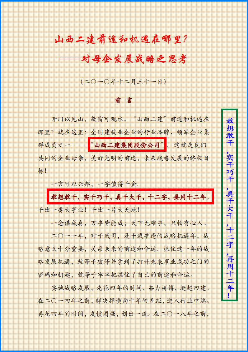 十三年后的今天,我再一次深入思考,山西二建的前途在哪里?客观地讲,依然停留在“二次创业”的喜悦和满足之中,并没有和真正意义上开始“第三次创业”——即市场化的股份制改造!