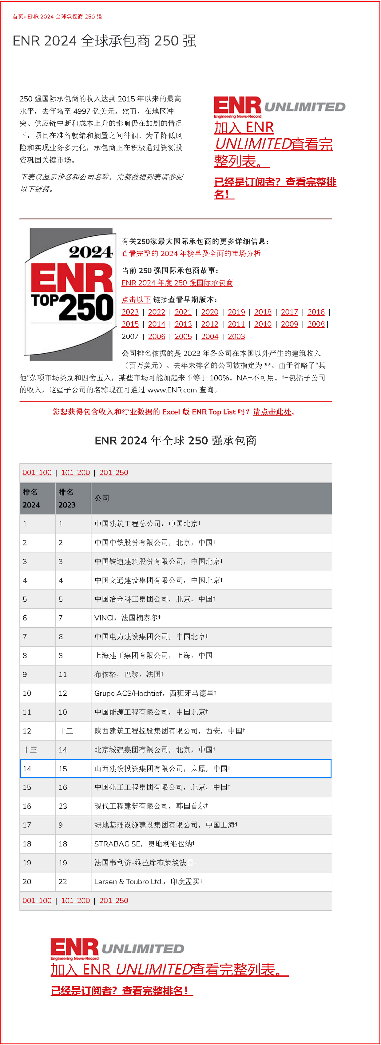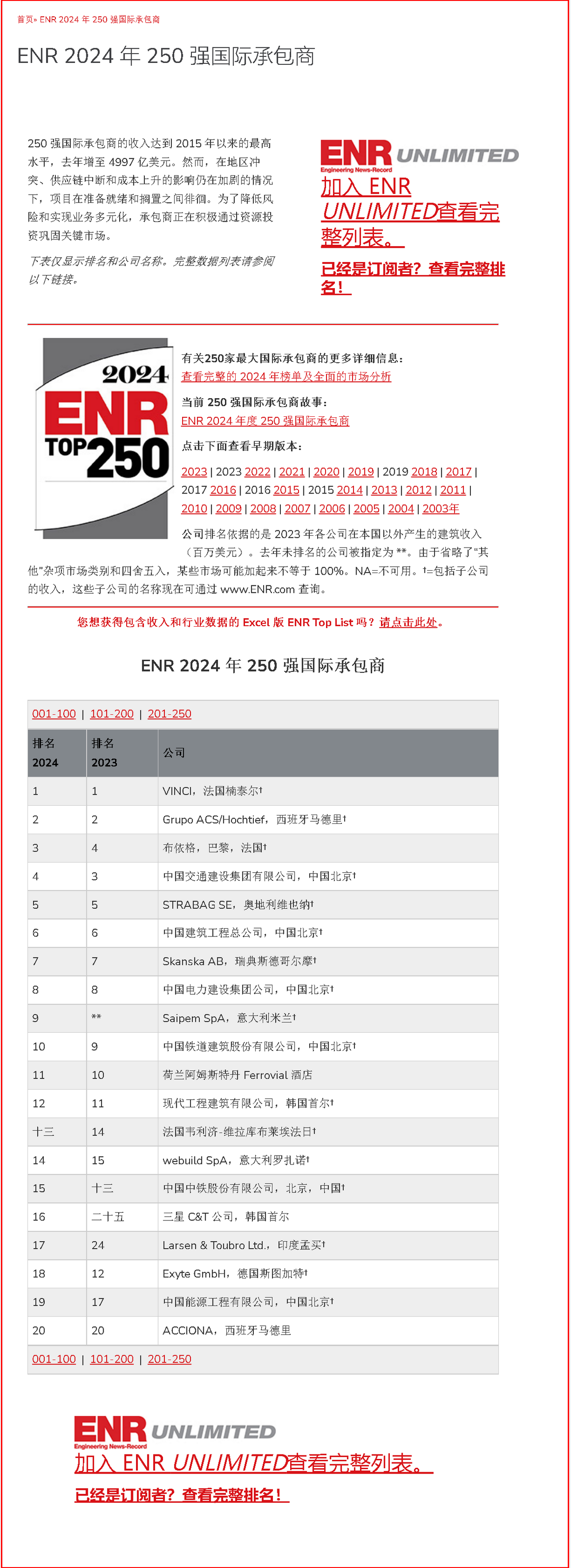 2006-2024年ENR国际承包商250强中国内地企业统计表