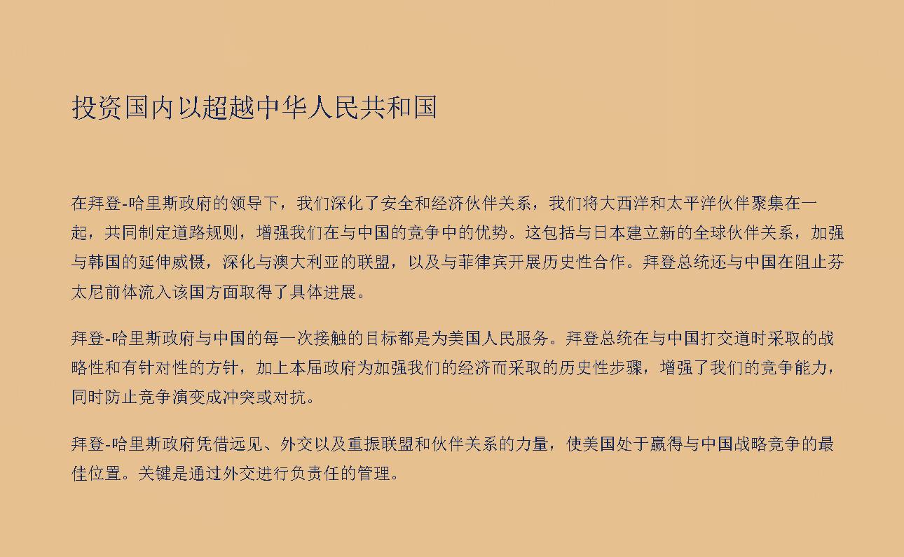 拜登-哈里斯政府凭借远见、外交以及重振联盟和伙伴关系的力量,使美国处于赢得与中国战略竞争的最佳位置。关键是通过外交进行负责任的管理。