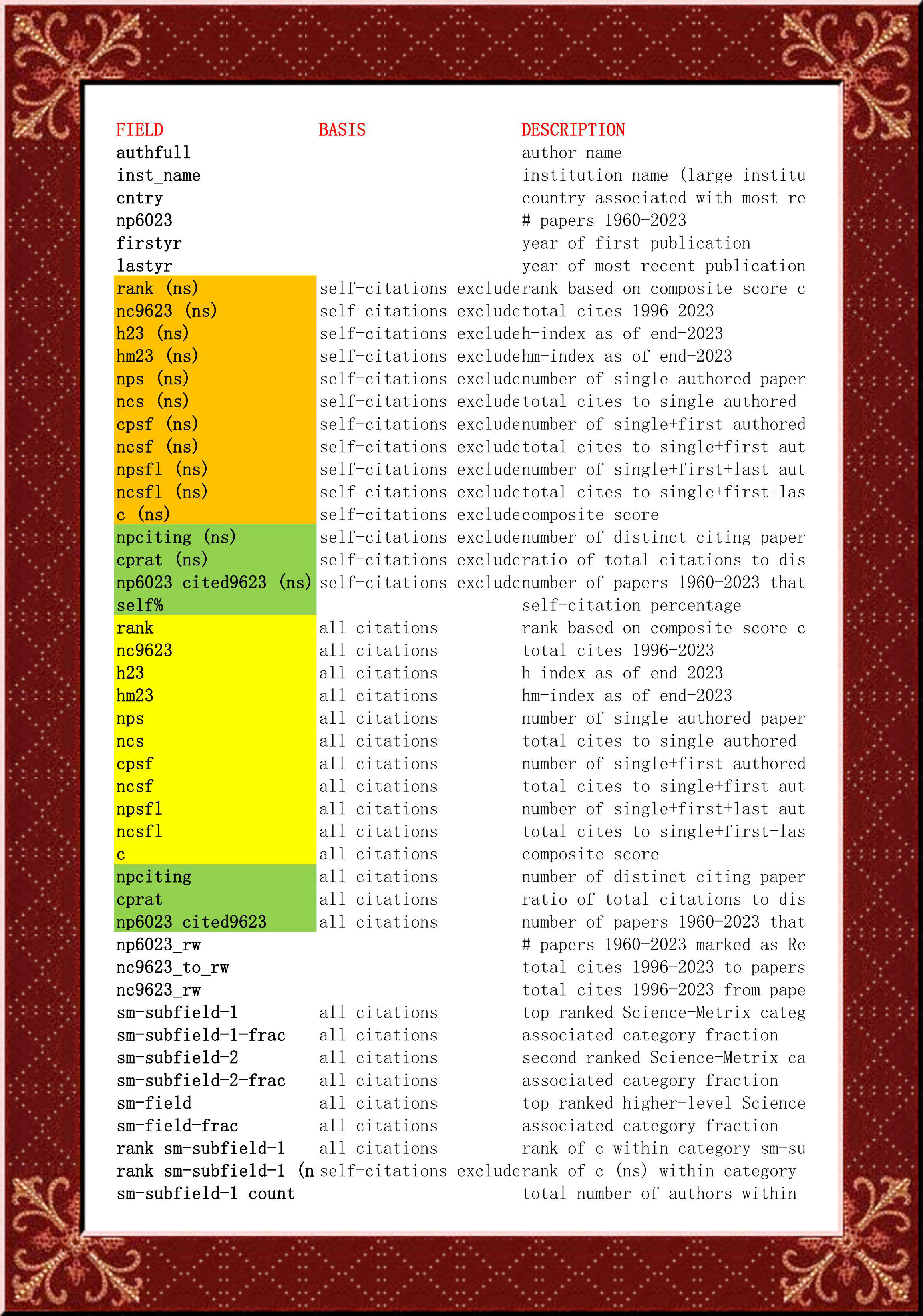 引用指标被广泛使用和滥用。我们创建了一个公开的高被引科学家数据库,提供有关引用、h 指数、共同作者调整后的 hm 指数、不同作者职位的论文引用和综合指标(c 分数)的标准化信息。单独的数据显示了整个职业生涯的数据,并单独显示了最近一年的影响。给出了有无自引的指标以及引用与施引论文的比率,并在最近的迭代中添加了撤回论文的数据(基于撤回观察数据库)以及撤回论文的引用。根据标准 Science-Metrix 分类,科学家被分为 22 个科学领域和 174 个子领域。还为所有至少发表 5 篇论文的科学家提供特定领域和子领域的百分位数。整个职业生涯的数据更新至 2023 年底,最近一年的数据与 2023 日历年收到的引用有关。选择基于 c 分数(有或没有自引)或百分位排名前 100,000 名科学家子领域排名2%以上。此版本 (7) 基于 Scopus 2024 年 8 月 1 日的快照,更新至 2023 年引文结束。本工作使用 Scopus 数据。使用截至 2024 年 8 月 1 日的所有 Scopus 作者资料进行计算。如果某个作者未出现在列表中,那只是因为综合指标值不够高,无法出现在列表中。这并不意味着作者做得不好。另请注意,数据库已以存档形式发布,不会更改。发布的版本反映了计算时的 Scopus 作者简介。因此,我们建议作者确保他们的 Scopus 资料准确无误。不应向我们发送 SCOPUS 数据更正请求(包括隶属关系更正)。它们应直接发送到 Scopus,最好使用 Scopus 到 ORCID 反馈向导 (https://orcid.scopusfeedback.com/),以便在未来引文指标数据库的任何年度更新中可以使用正确的数据。 c-score 侧重于影响力(引用)而不是生产力(出版物数量),它还包含有关共同作者和作者职位(单一、第一、最后作者)的信息。如果您还有其他问题,请参阅有关常见问题的附件。最后,我们提醒用户,所有引文指标都有局限性,其使用应谨慎且明智。如需更多阅读,我们参考莱顿宣言:https://www.nature.com/articles/520429a