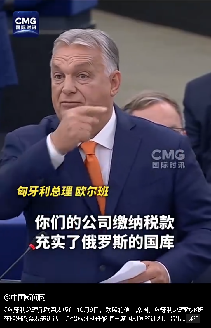 冯德莱恩发言期间在为欧盟政策辩护的同时,选择通过给欧尔班和匈牙利政府扣上“亲俄”、“亲华”的帽子予以回击,声称欧尔班与俄总统普京交好,允许来自中俄的“外国干涉,让匈牙利人民失望”。