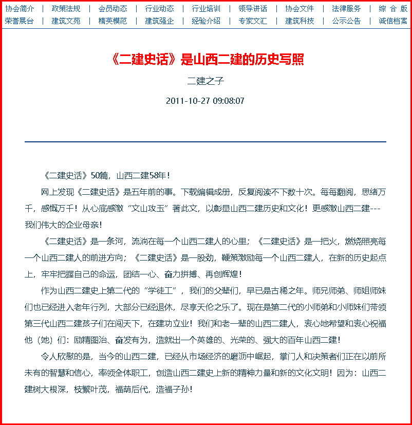 对山西三利装饰集团有限公司印象深刻,是2011年我撰写《二建史话》是山西二建的历史写照一文,被三利集团网站收入《美文欣赏》栏目之中。