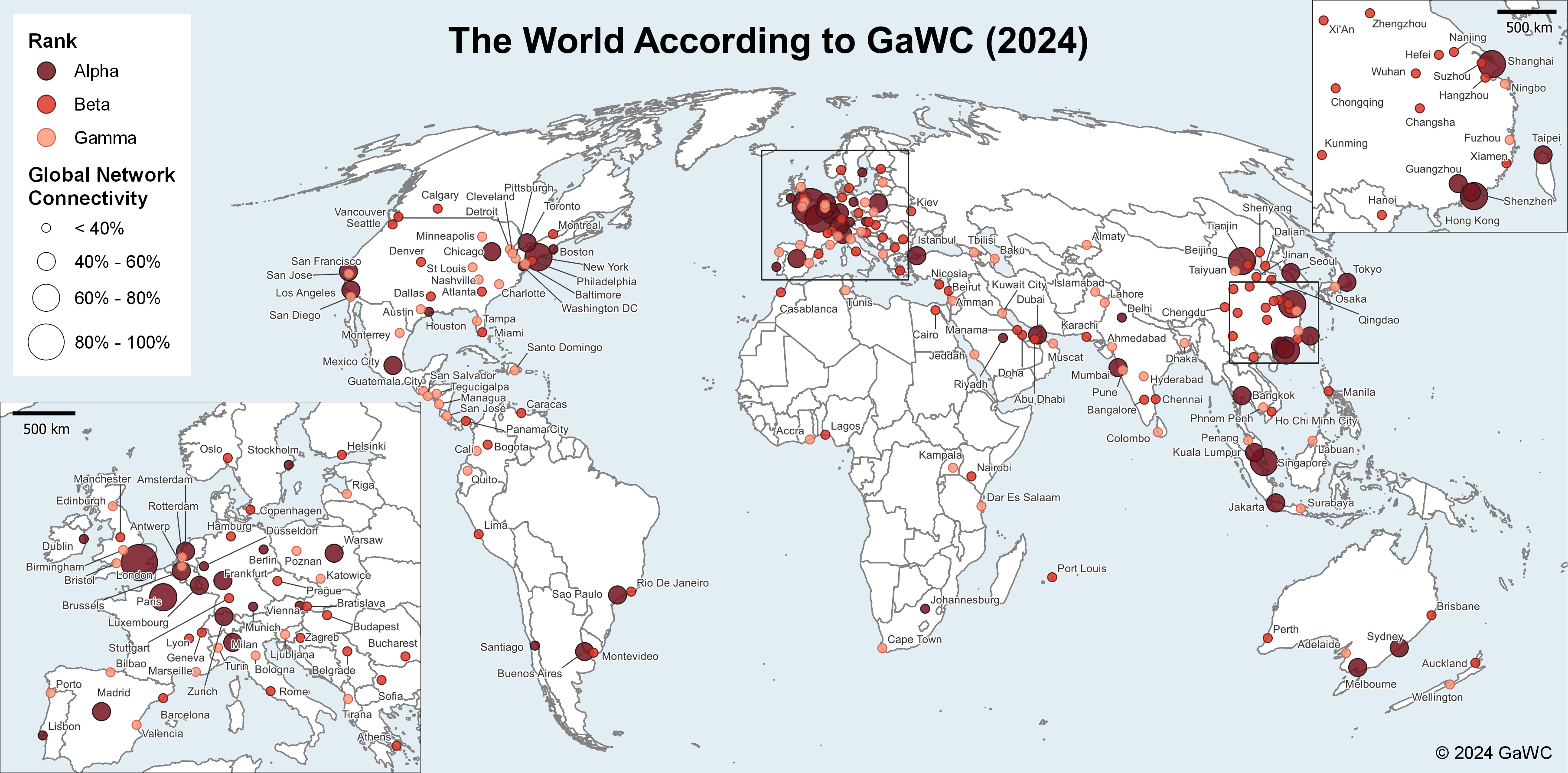 使用 GaWC 的联锁网络模型对城市的先进生产性服务业进行评估。流量的间接测量用于计算城市的网络连通性,从而衡量城市融入世界城市网络的程度。