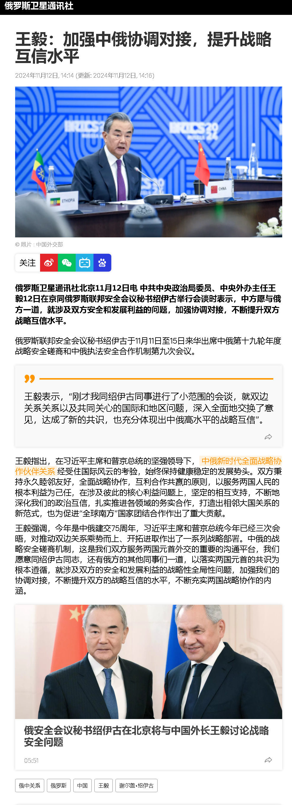 而普京在公开祝贺特朗普当选美国总统时,也曾表示特朗普希望恢复美俄关系,并帮助结束俄乌冲突的表态“是值得关注的”。可见,普京政府还是非常期待特朗普上台后能够为解决俄乌冲突注入积极因素,准备认真听取美方的建议。这自然也将为俄乌局势带来新的走向。绍伊古此次来中国,不排除就是想与中国讨论一下此事,想听听中国的意见。那中方会是什么态度呢?事实上,前几天中方被问及普京的上述表态时,我外交部发言人毛宁就已经说了,美俄关系如何发展是美国和俄罗斯两个主权国家的事。至于乌克兰危机,中方的立场是一贯的,我们支持一切有利于政治解决冲突的努力。