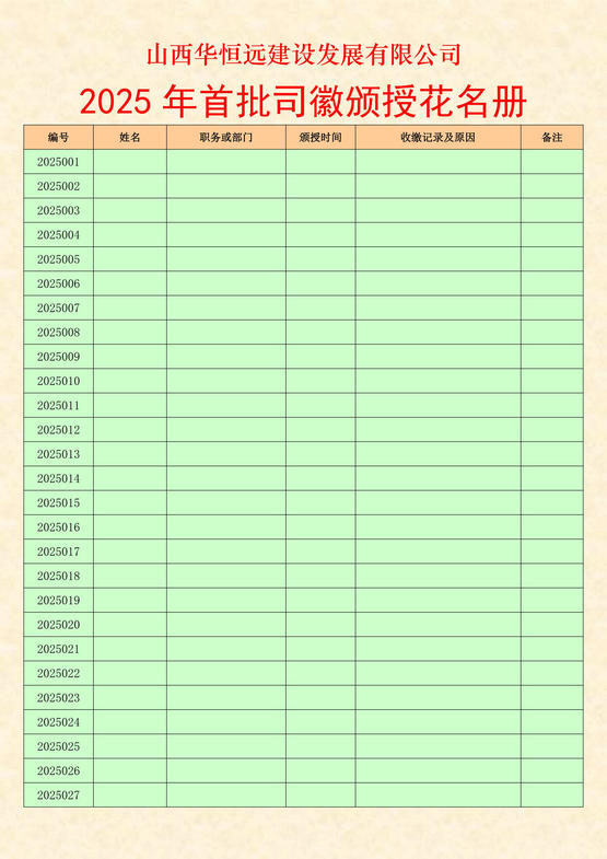 编号为2025001——2025100,共计100枚。按公司任命和安排工作职务登记造册依序颁授,离职或辞退员工,必须收缴,以为后续者循环佩备之用!