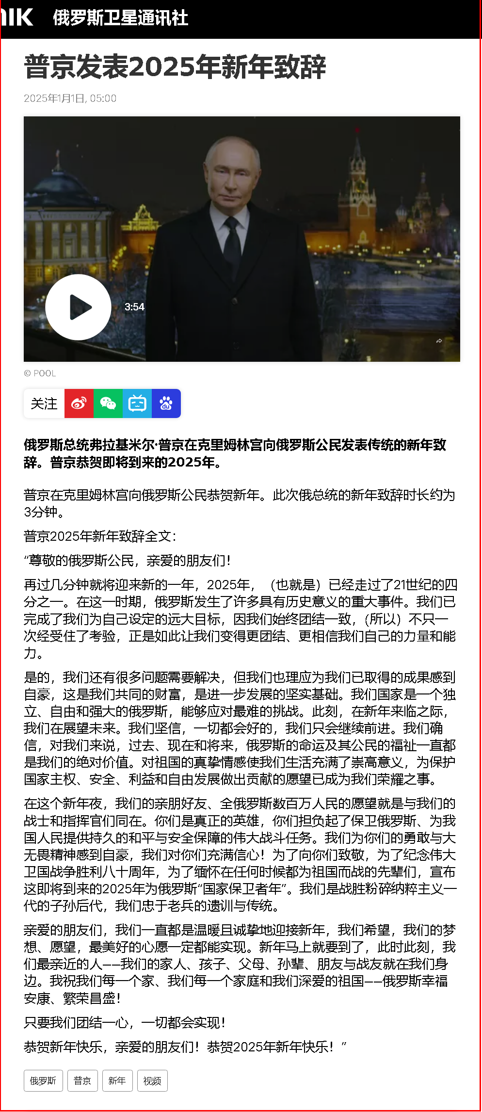 俄罗斯总统普京2025年新年致辞,向全世界发出一个强烈信号——那就是开创人类社会公平正义的新世界!