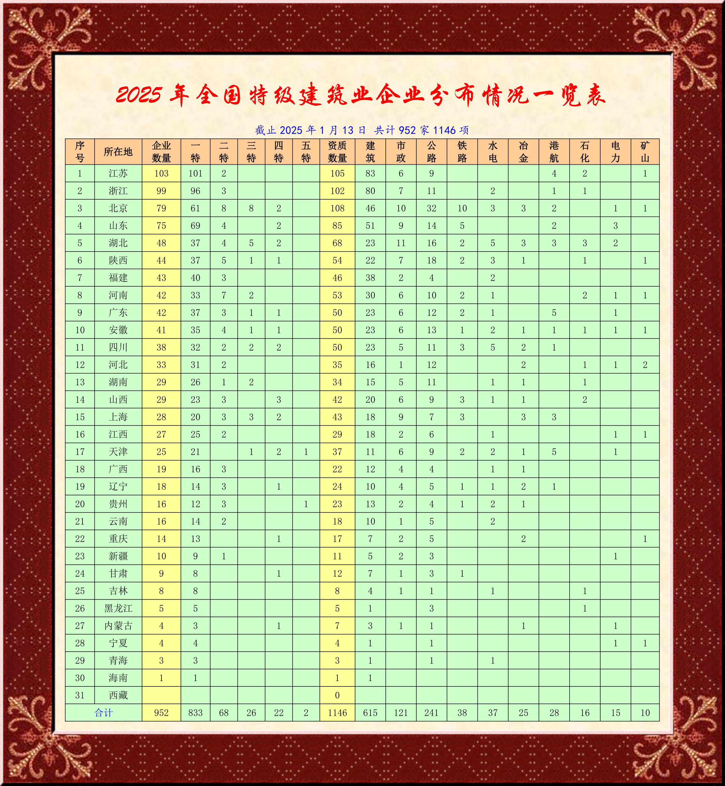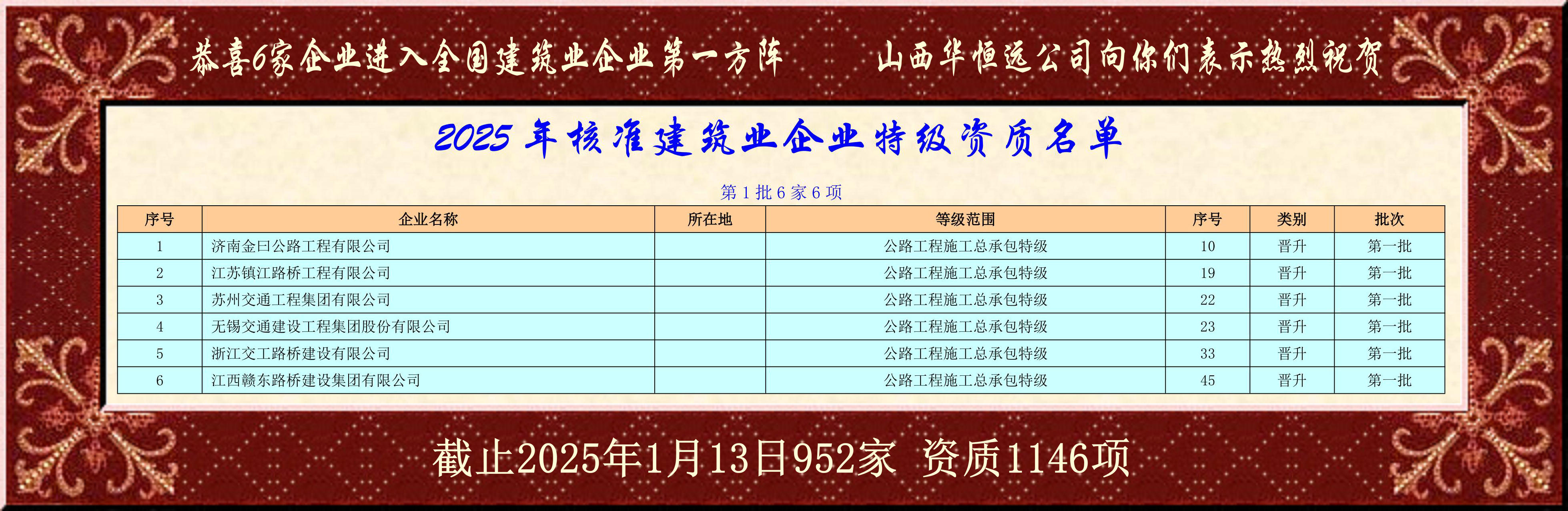 在2025年新春佳节即将到来之际,今天住建部公告了今年核准第一批建筑业企业资质名单,其中6家企业晋升公路工程总承包特级资质。江苏3家、山东、浙江、江西各一家。至此全国特级资质企业952家,拥有资质1146项。