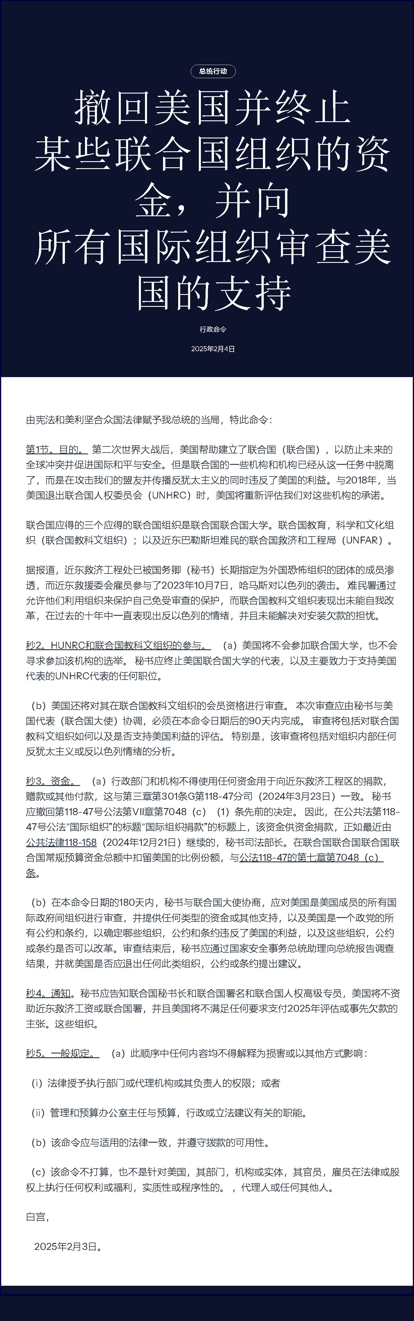 行政令还要求继续停止向联合国近东巴勒斯坦难民救济和工程处(近东救济工程处)提供支持,并评估美国在联合国教科文组织中的参与情况。