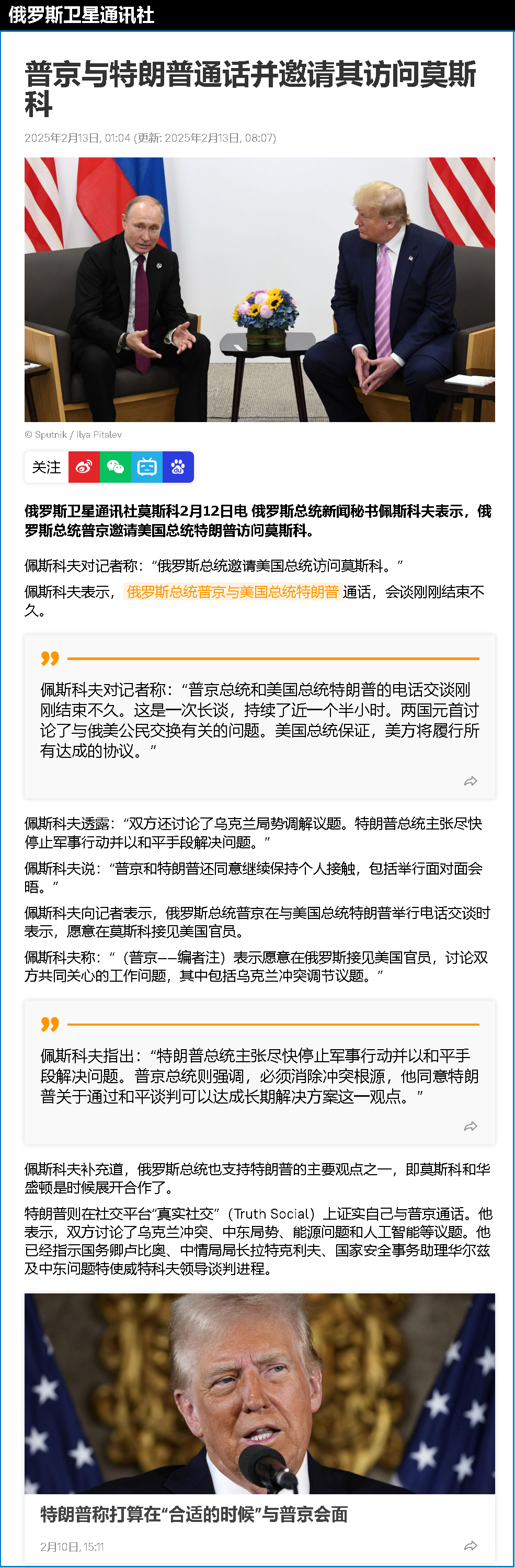 当天早些时候,特朗普先后与普京和乌克兰总统泽连斯基通电话,讨论乌克兰局势等问题。特朗普表示,上述两个通话成果都“非常好”,普京和泽连斯基均希望俄乌实现和平。