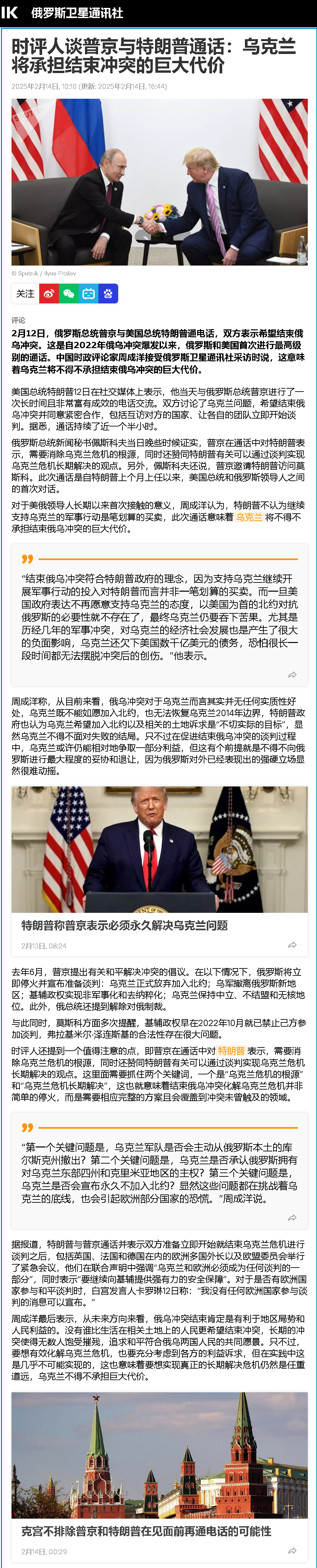 近日,美国总统特朗普先后与俄总统普京、乌总统泽连斯基通电话。他随后表示,美俄双方同意就结束俄乌冲突进行“紧密合作”,并派遣各自团队“立即开始谈判”。美国众议员迈克尔·麦考尔15日在出席慕安会期间透露,美国国务卿鲁比奥等官员和俄方官员将在沙特阿拉伯会晤,讨论俄乌冲突问题。