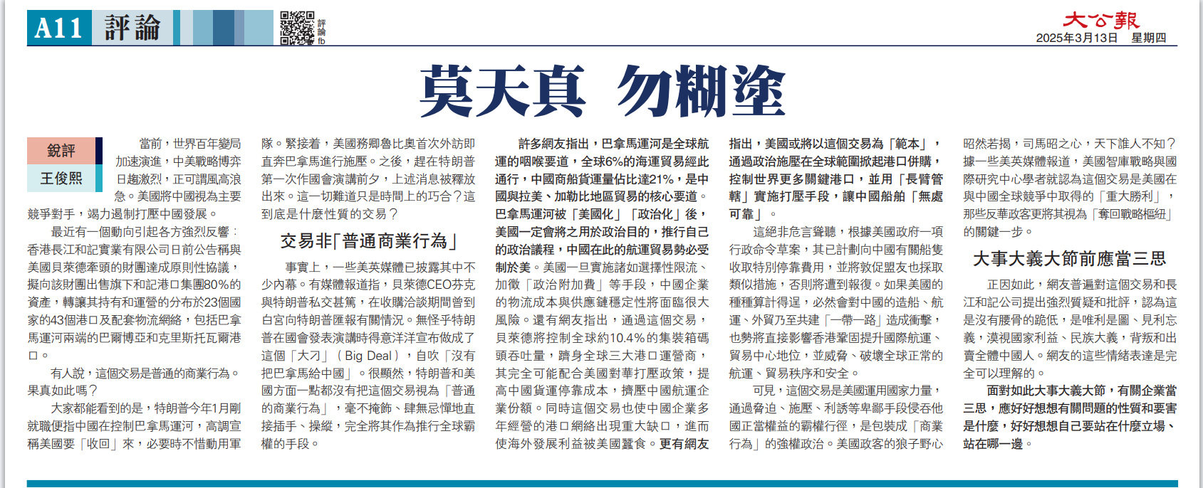 锐评/莫天真 勿糊涂\王俊熙2025-03-13