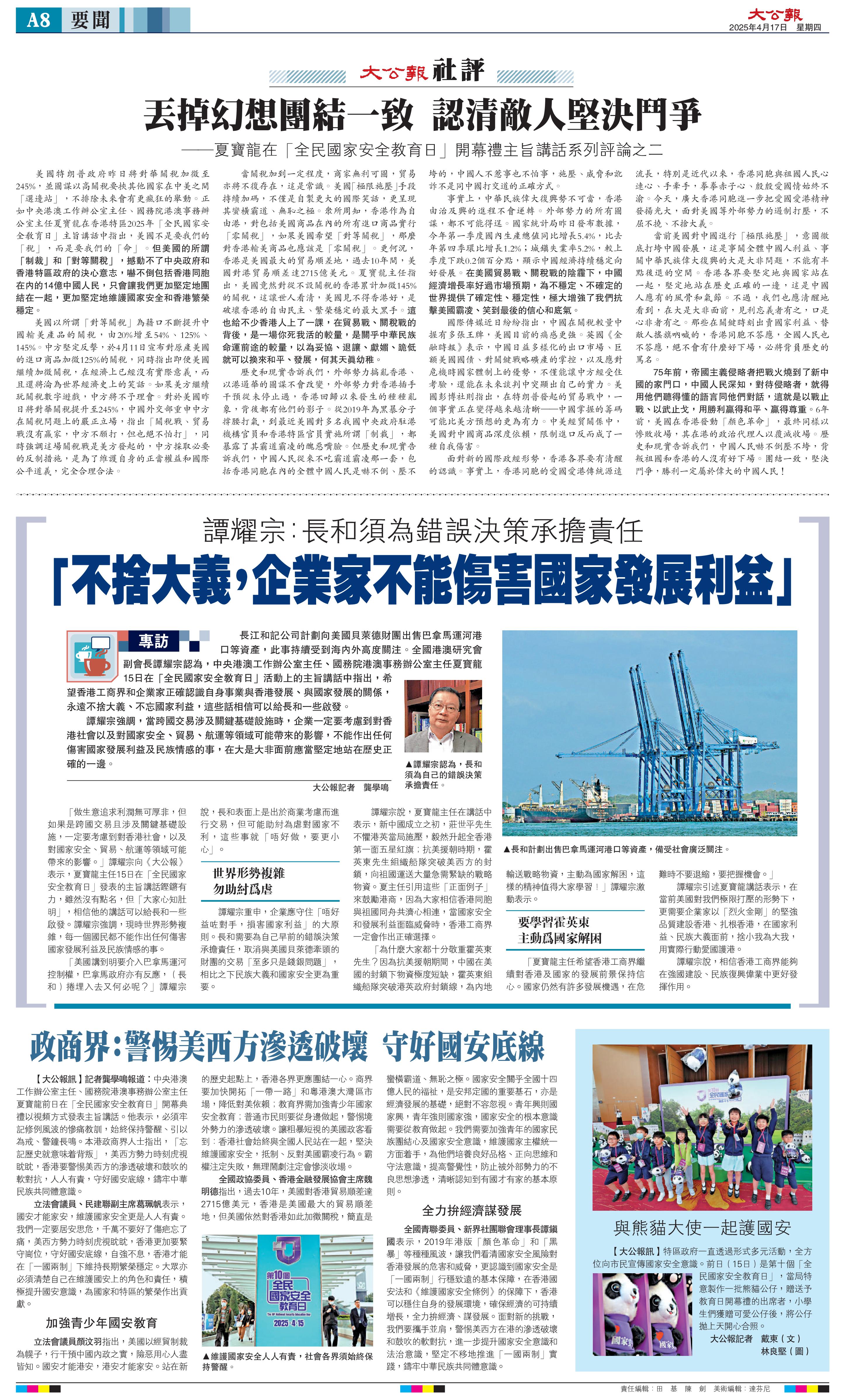 「做生意追求利润无可厚非,但如果是跨国交易且涉及关键基础设施,一定要考虑到对香港社会,以及对国家安全、贸易、航运等领域可能带来的影响。」谭耀宗向《大公报》表示,夏宝龙主任15日在「全民国家安全教育日」发表的主旨讲话铿锵有力,虽然没有点名,但「大家心知肚明」,相信他的讲话可以给长和一些启发。谭耀宗强调,现时世界形势复杂,每一个国民都不能作出任何伤害国家发展利益及民族情感的事。