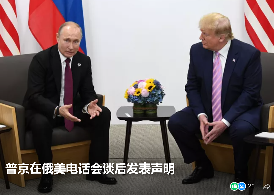 特朗普在与普京交谈后表示俄罗斯和乌克兰将立即开始停火和停止冲突的谈判;