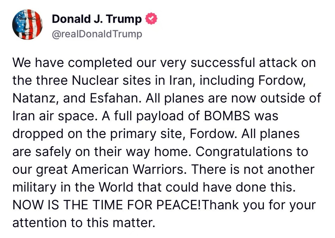 6月17日,他宣称伊朗“希望达成协议”,但“为时已晚”,并在社交媒体发帖暗示伊朗“无条件投降”。