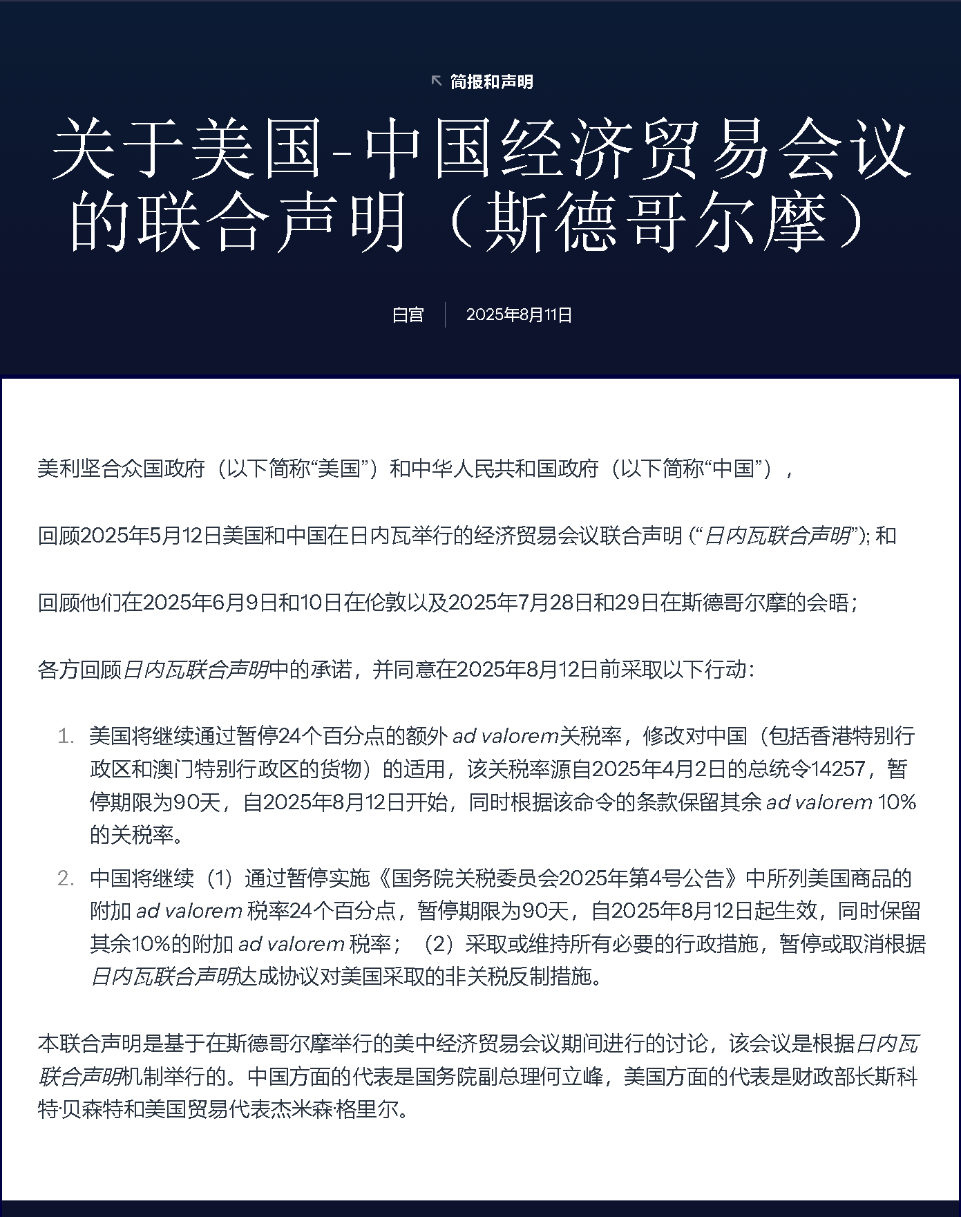 本联合声明是基于在斯德哥尔摩举行的美中经济贸易会议期间进行的讨论,该会议是根据日内瓦联合声明机制举行的。中国方面的代表是国务院副总理何立峰,美国方面的代表是财政部长斯科特·贝森特和美国贸易代表杰米森·格里尔。