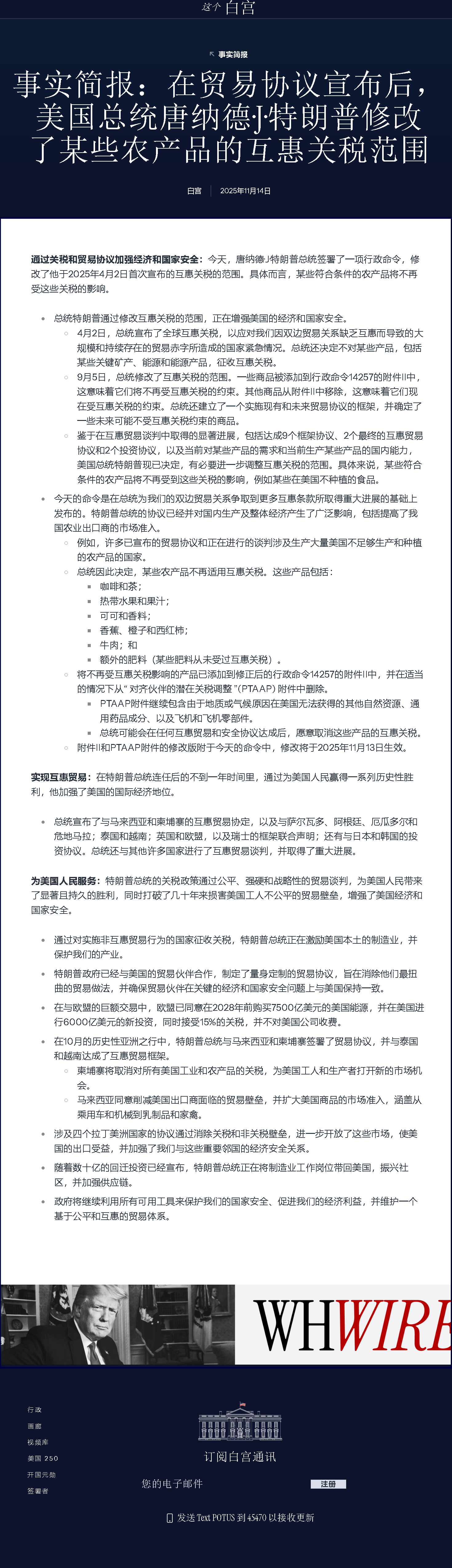 通过关税和贸易协议加强经济和国家安全:今天,唐纳德·J·特朗普总统签署了一项行政命令,修改了他于2025年4月2日首次宣布的互惠关税的范围。具体而言,某些符合条件的农产品将不再受这些关税的影响。