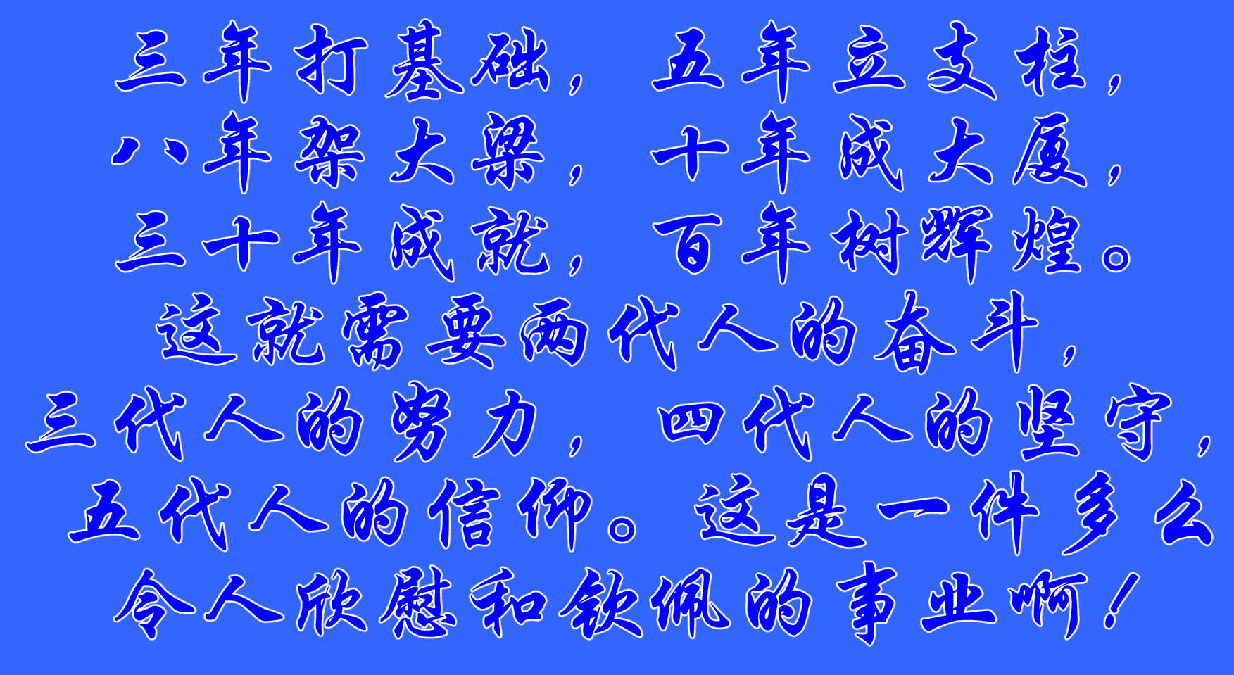 三年打基础,五年立支柱,八年架大梁,十年成大厦,三十年成就,百年树辉煌。这就需要两代人的奋斗,三代人的努力,四代人的坚守,五代人的信仰。这是一件多么令人欣慰和钦佩的事业啊!