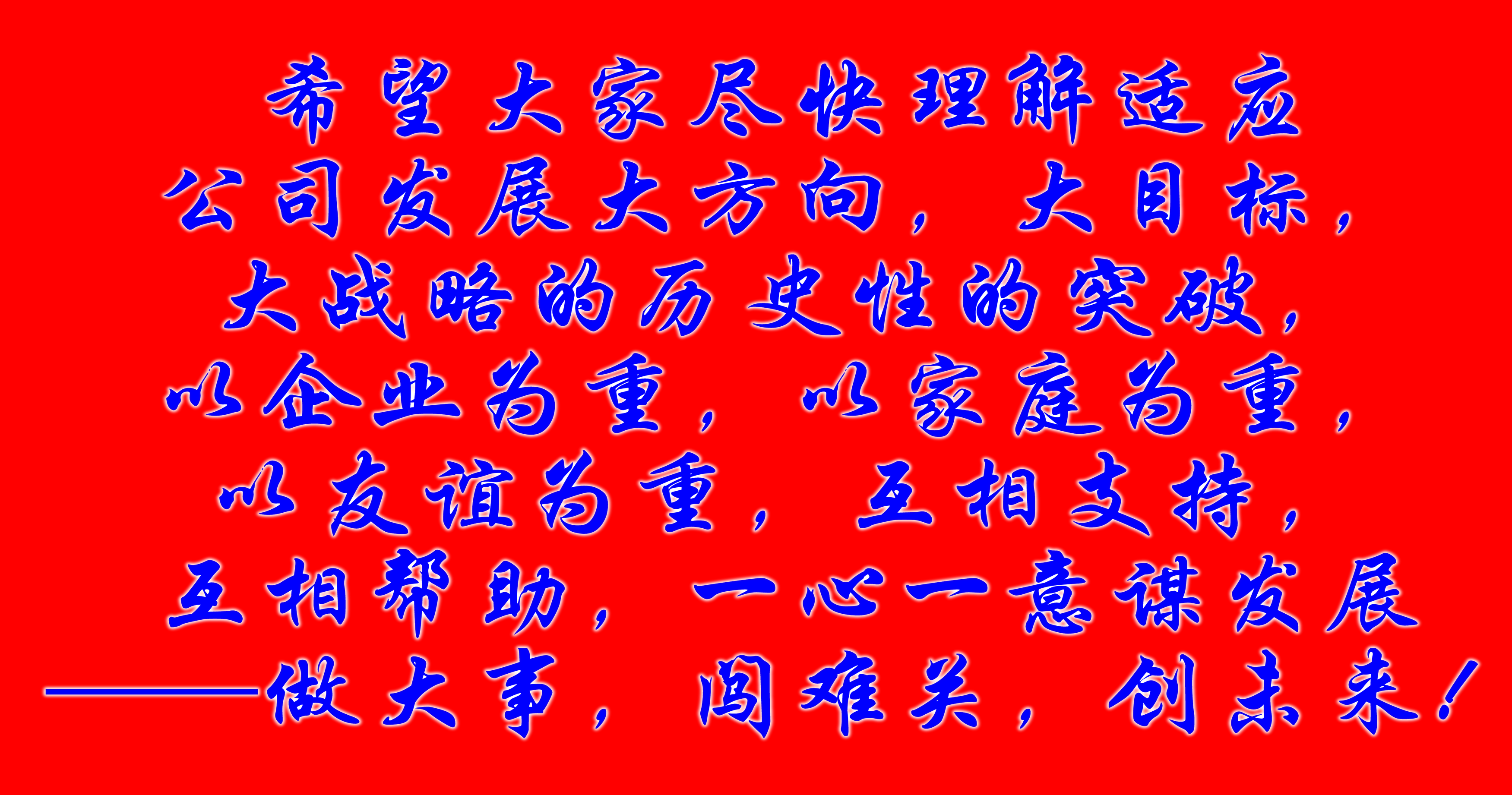 希望大家尽快理解适应公司发展大方向,大目标,大战略的历史性的突破,以企业为重,以家庭为重,以友谊为重,互相支持,互相帮助,一心一意谋发展,做大事,闯难关,创未来!