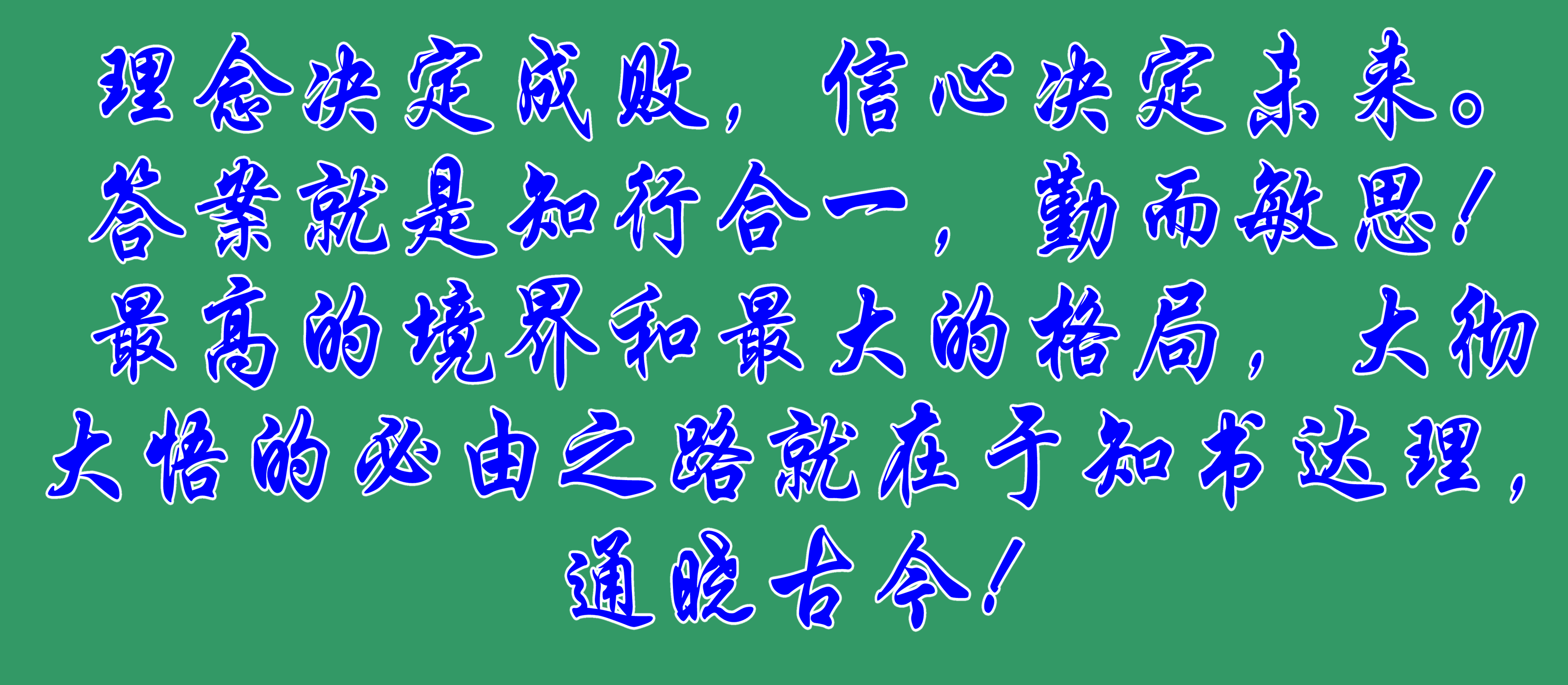 理念决定成败,信心决定未来。答案就是知行合一,勤而敏思!最高的境界和最大的格局,大彻大悟的必由之路就在于知书达理,通晓古今!