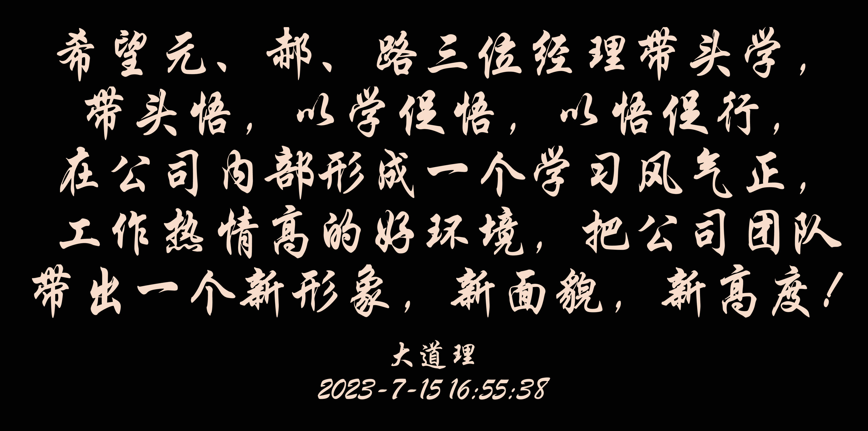 认真学习总书记讲话精神,深刻领会讲话核心内涵和要义,提高理解能力和执行能力,把百乐博bIbo建设好是学习根本要求,希望元、郝、路三位经理带头学,带头悟,以学促悟,以悟促行,在公司内部形成一个学习风气正,工作热情高的好环境,把公司团队带出一个新形象,新面貌,新高度!