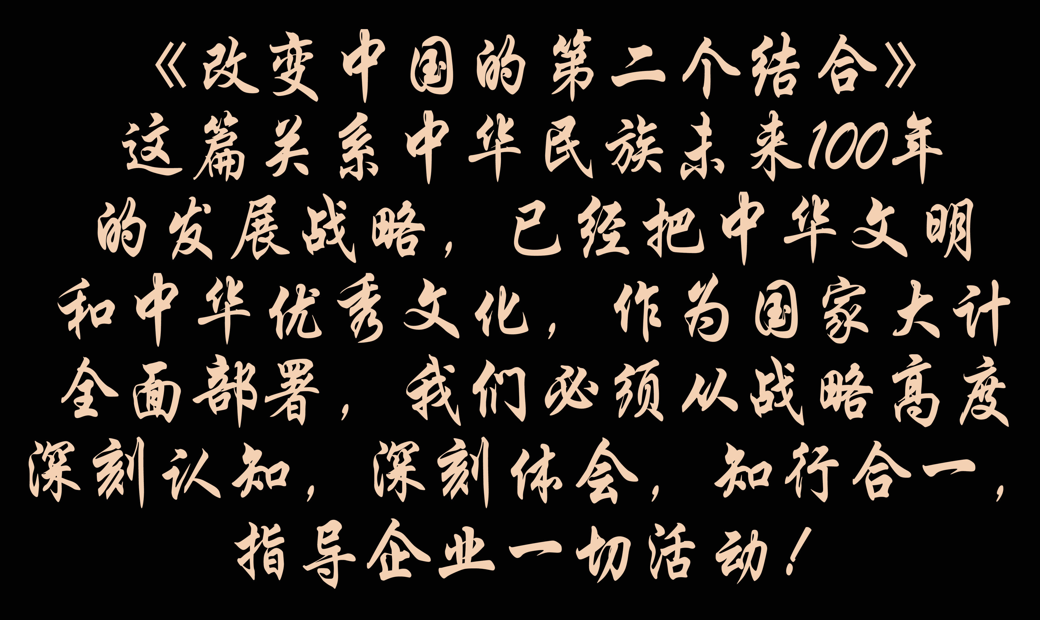《改变中国的第二个结合》这篇关系中华民族未来100年的发展战略,已经把中华文明和中华优秀文化,作为国家大计全面部署,我们必须从战略高度深刻认知,深刻体会,知行合一,指导企业一切活动!