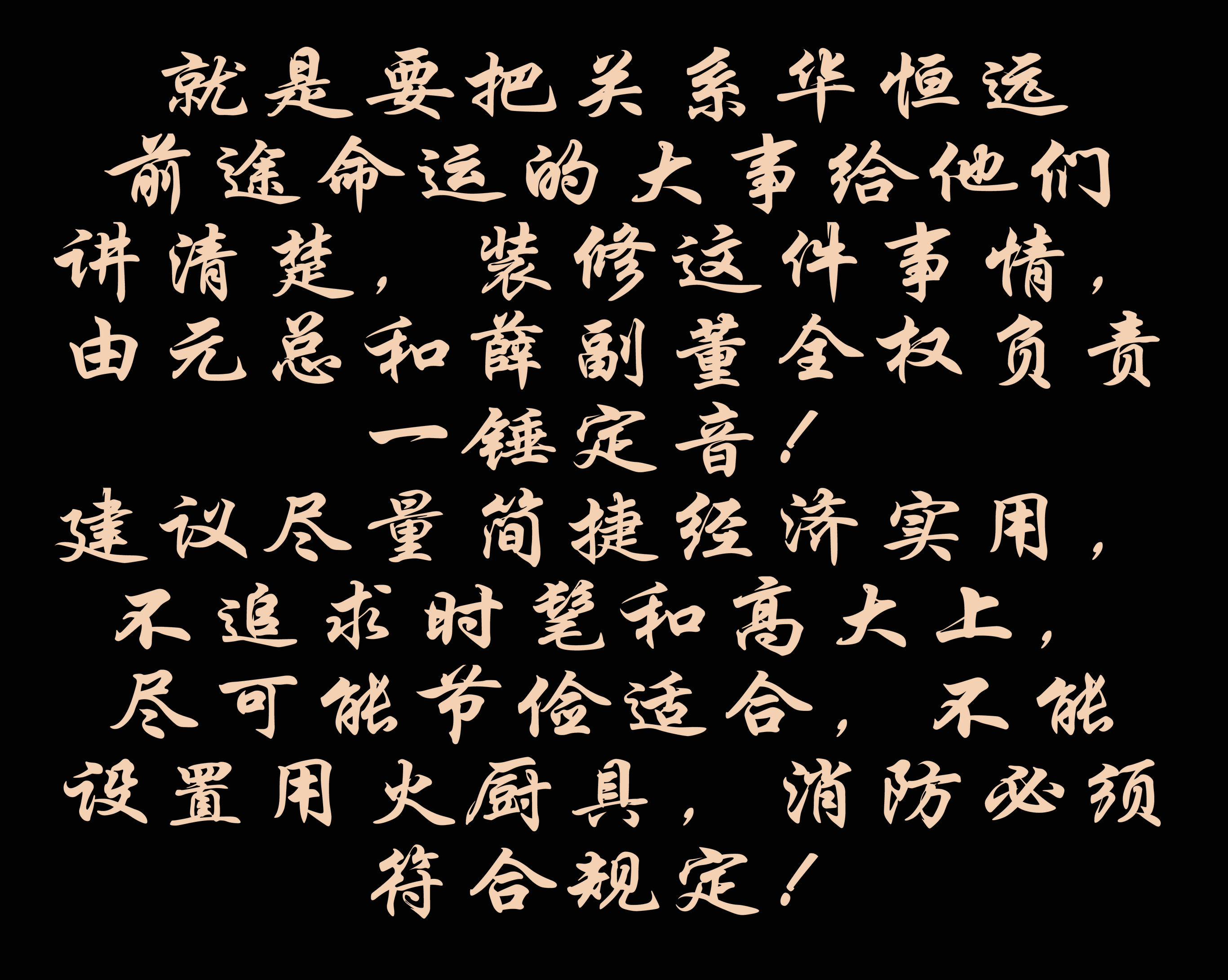 我下午约见董事长夫妇一晤,就是要把关系百乐博bIbo前途命运的大事给他们讲清楚,装修这件事情,由元总和薛副董全权负责一锤定音!