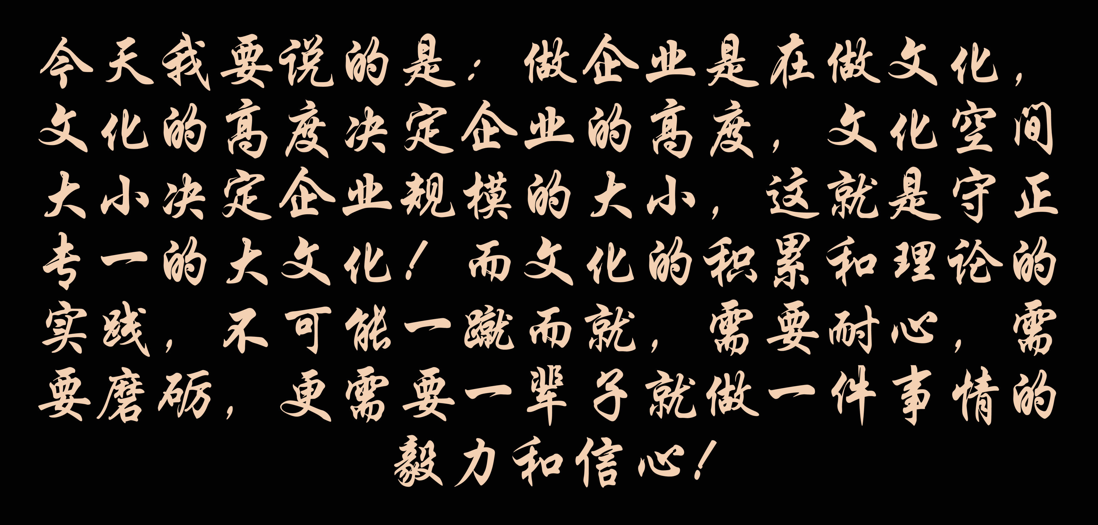 今天我要说的是:做企业是在做文化,文化的高度决定企业的高度,文化空间大小决定企业规模的大小,这就是守正专一的大文化!而文化的积累和理论的实践,不可能一蹴而就,需要耐心,需要磨砺,更需要一辈子就做一件事情的毅力和信心!