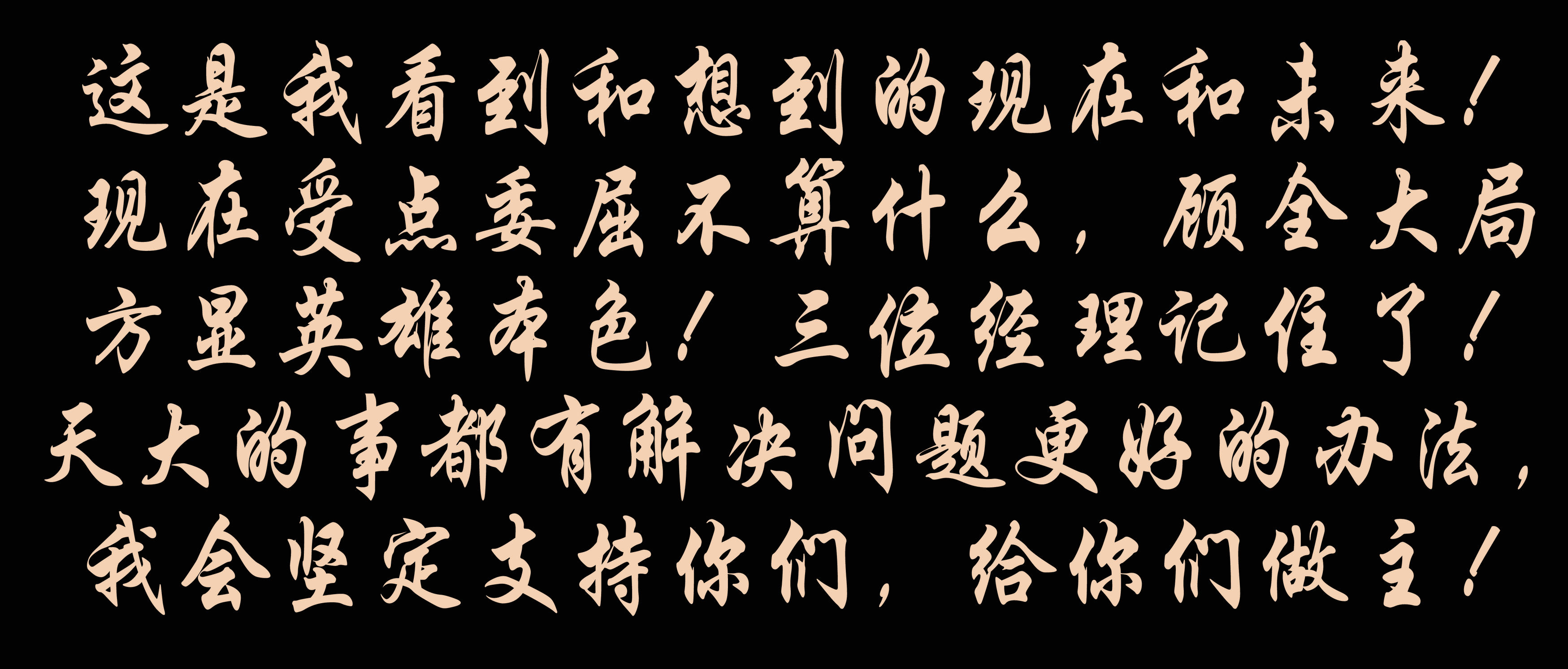 这是我看到和想到的现在和未来!现在受点委屈不算什么,顾全大局方显英雄本色!三位经理记住了!