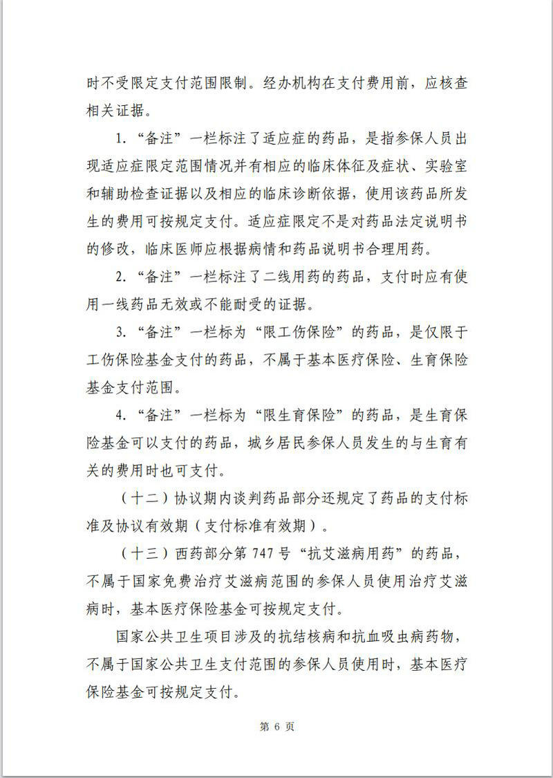 (十一)“备注”栏中对部分药品规定了限定支付范围,是指符合规定情况下参保人员发生的药品费用,可按规定由基本医疗保险或生育保险基金支付。工伤保险支付药品费用时不受限定支付范围限制。经办机构在支付费用前,应核查相关证据。