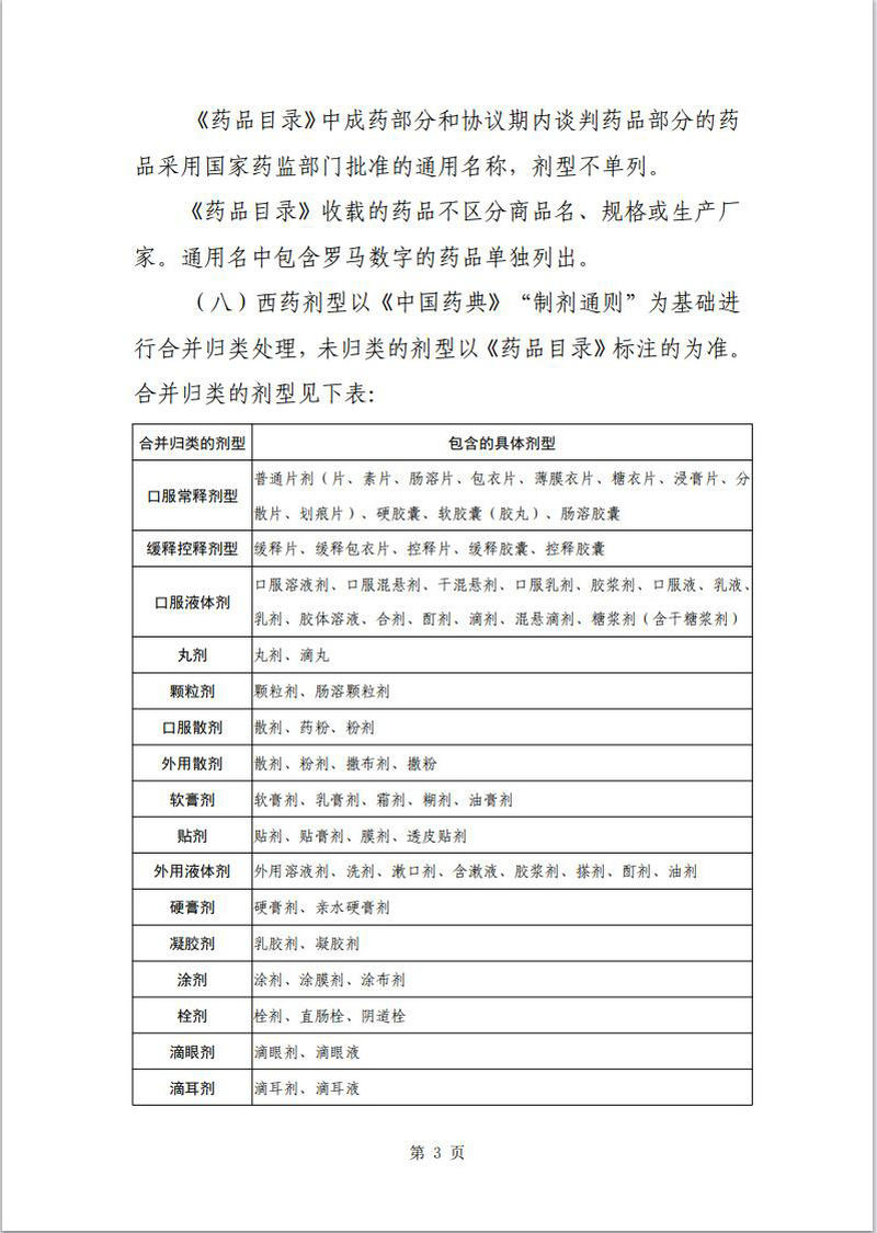 (八)西药剂型以《中国药典》“制剂通则”为基础进行合并归类处理,未归类的剂型以《药品目录》标注的为准。合并归类的剂型见下表: