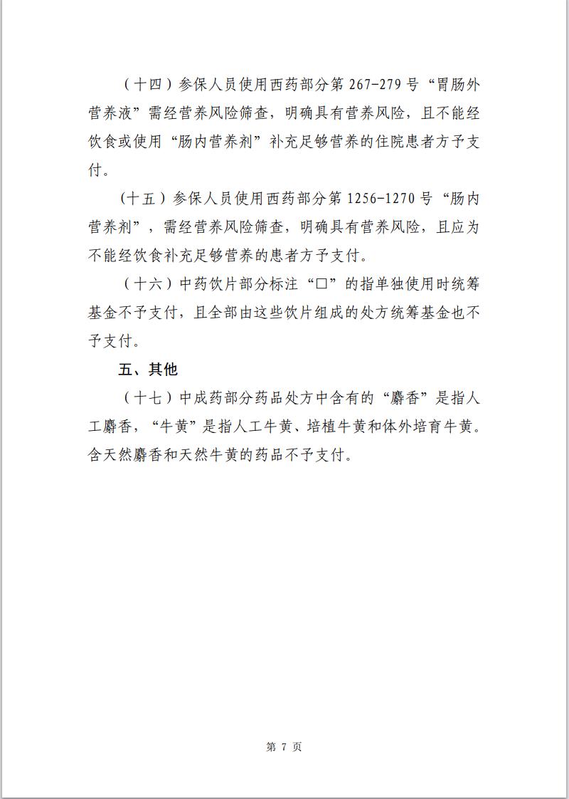 (十五)参保人员使用西药部分第1256-1270号“肠内营养剂”,需经营养风险筛查,明确具有营养风险,且应为不能经饮食补充足够营养的患者方予支付。