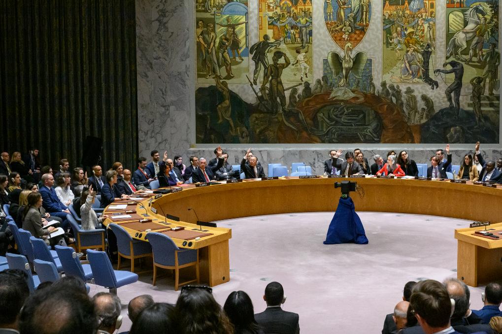 这是12月8日在位于纽约的联合国总部拍摄的联合国安理会会议现场。美国当天否决了联合国安理会一份旨在推动实现巴以人道主义停火的决议草案。新华社发(联合国供图/洛伊·费利佩摄)
