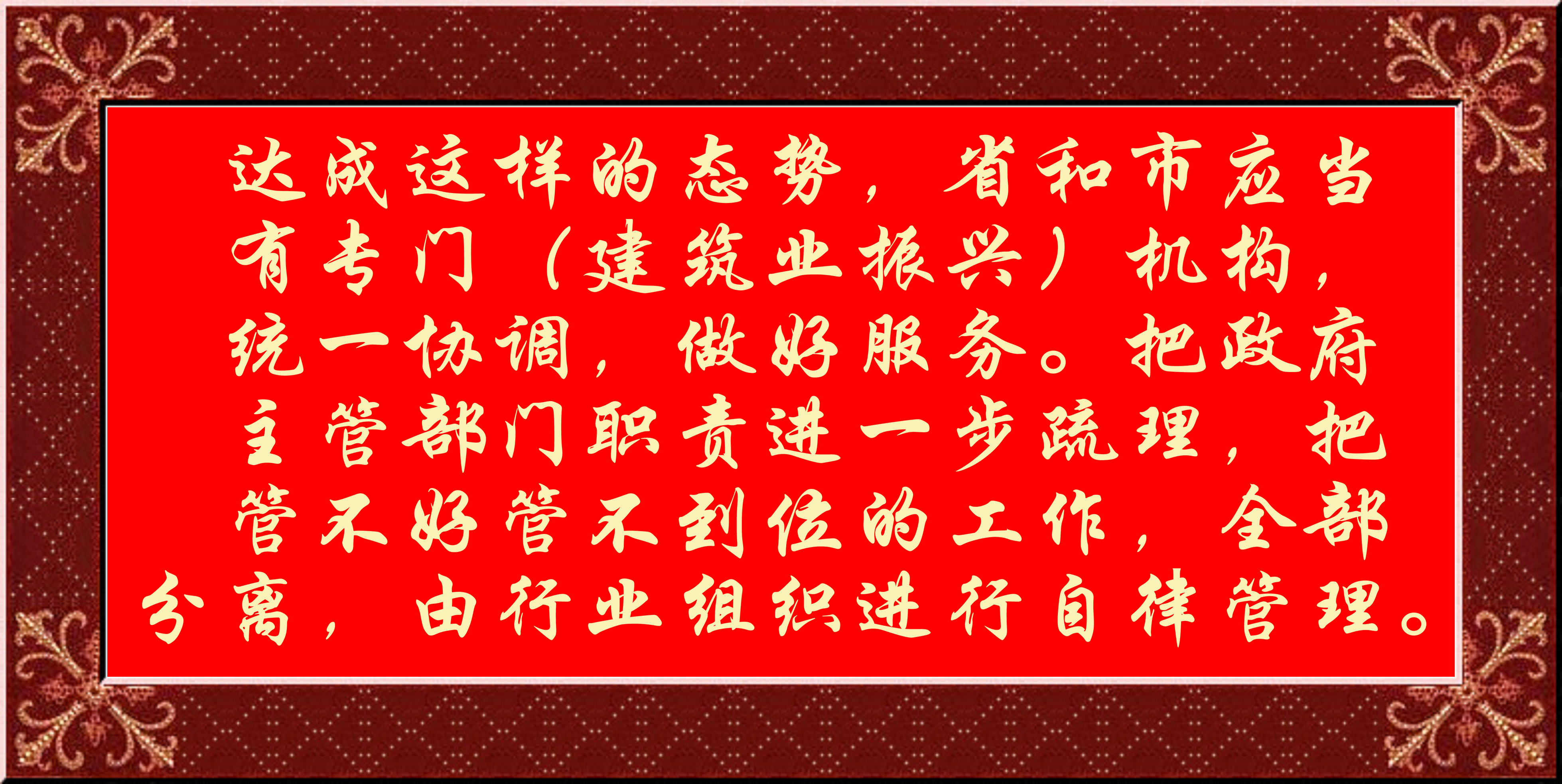 达成这样的态势,省和市应当有专门(建筑业振兴)机构,统一协调,做好服务。把政府主管部门职责进一步疏理,把管不好管不到位的工作,全部分离,由行业组织进行自律管理。