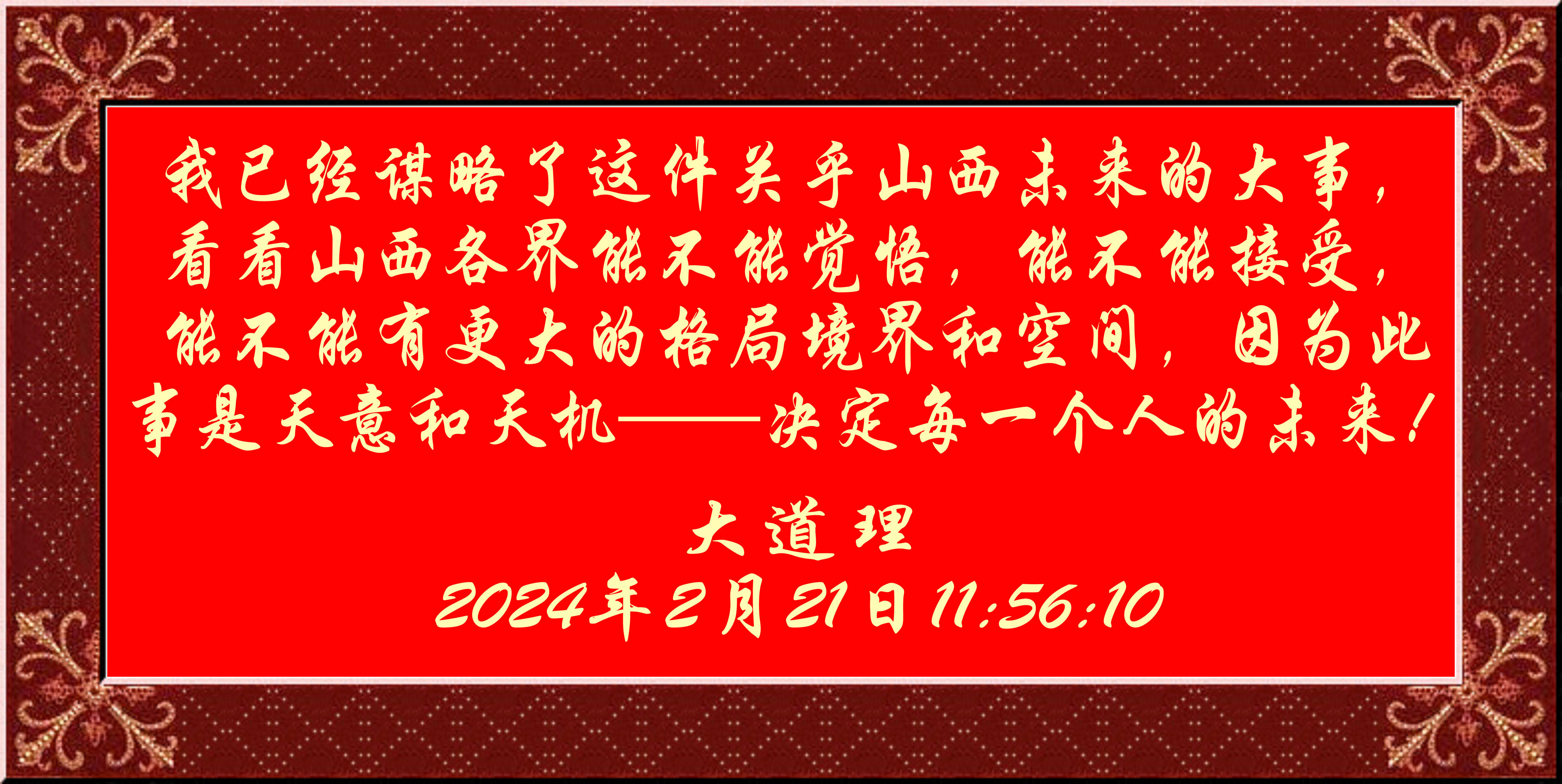 我已经谋略了这件关乎山西未来的大事,看看山西各界能不能觉悟,能不能接受,能不能有更大的格局境界和空间,因为此事是天意和天机——决定每一个人的未来!