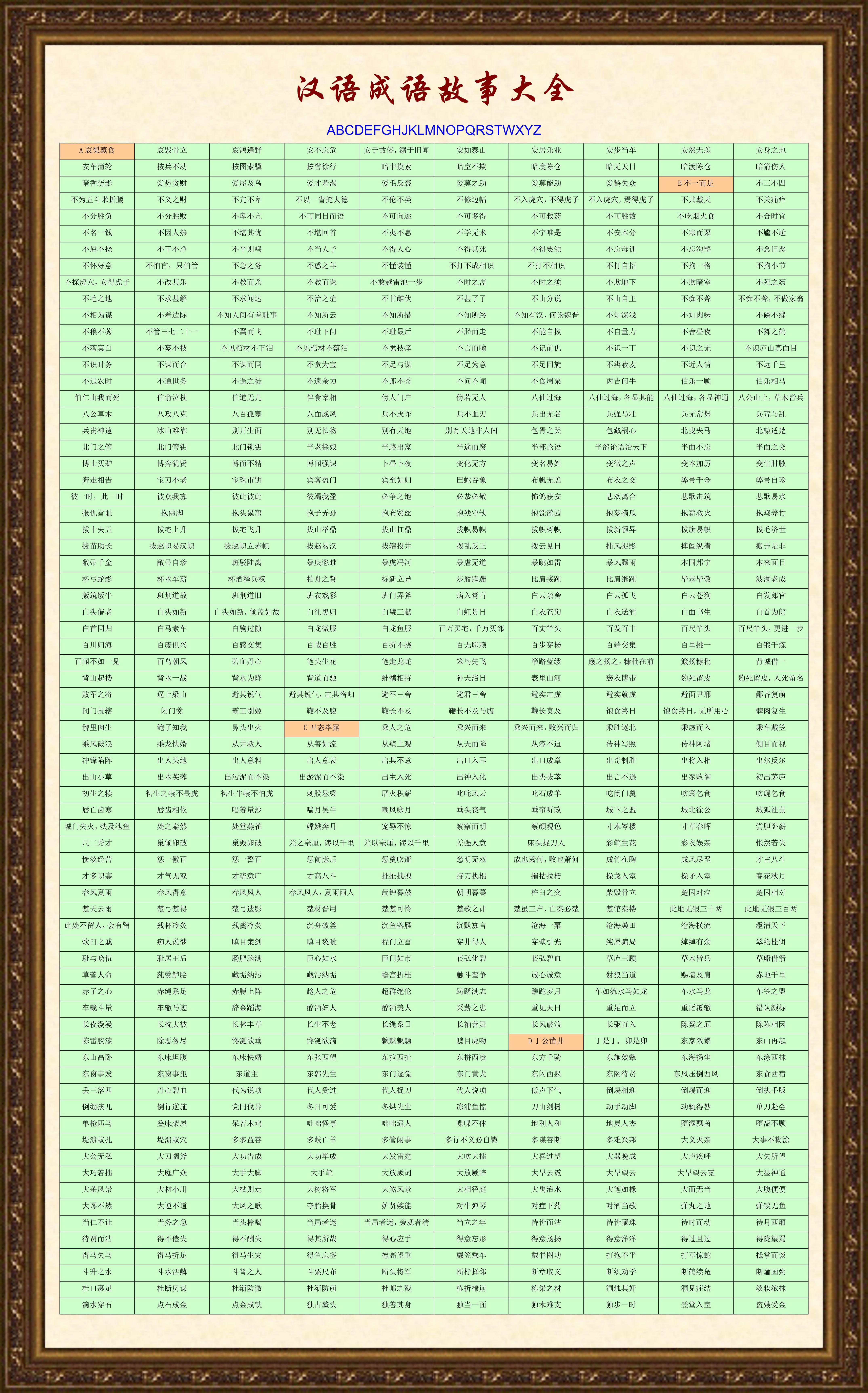 安如泰山 安居乐业 安步当车 安然无恙 安身之地 安车蒲轮 按兵不动 按图索骥 按辔徐行 暗中摸索 暗室不欺 暗度陈仓 暗无天日暗渡陈仓 暗箭伤人 暗香疏影 爱势贪财 爱屋及乌 爱才若渴 爱毛反裘 爱莫之助 爱莫能助 爱鹤失众 B不一而足 不三不四 不为五斗米折腰 不义之财 不亢不卑 不以一眚掩大德 不伦不类 不修边幅 不入虎穴,不得虎子 不入虎穴,焉得虎子 不共戴天 不关痛痒 不分胜负 不分胜败 不卑不亢 不可同日而语 不可向迩 不可多得 不可救药 不可胜数 不吃烟火食 不合时宜 不名一钱 不因人热 不堪其忧 不堪回首 不夷不惠 不学无术 不宁唯是 不安本分 不寒而栗 不尴不尬 不屈不挠 不干不净 不平则鸣 不当人子 不得人心 不得其死 不得要领 不忘母训 不忘沟壑 不念旧恶 不怀好意 不怕官,只怕管 不急之务 不惑之年 不懂装懂 不打不成相识 不打不相识 不打自招 不拘一格 不拘小节 不探虎穴,安得虎子 不改其乐 不教而杀 不教而诛 不敢越雷池一步 不时之需 不时之须 不欺地下 不欺暗室 不死之药 不毛之地 不求甚解 不求闻达 不治之症 不甘雌伏 不甚了了 不由分说 不由自主 不痴不聋 不痴不聋,不做家翁 不相为谋 不着边际 不知人间有羞耻事 不知所云 不知所措 不知所终 不知有汉,何论魏晋 不知深浅 不知肉味 不磷不缁 不稂不莠 不管三七二十一 不翼而飞 不耻下问 不耻最后 不胫而走 不能自拔 不自量力 不舍昼夜 不舞之鹤 不落窠臼 不蔓不枝 不见棺材不下泪 不见棺材不落泪 不觉技痒 不言而喻 不记前仇 不识一丁 不识之无 不识庐山真面目 不识时务 不谋而合 不谋而同 不贪为宝 不足与谋 不足为意 不足回旋 不辨菽麦 不近人情 不远千里 不违农时 不通世务 不逞之徒 不遗余力 不郎不秀 不问不闻 不食周粟 丙吉问牛 伯乐一顾 伯乐相马 伯仁由我而死 伯俞泣杖 伯道无儿 伴食宰相 傍人门户 傍若无人 八仙过海 八仙过海,各显其能 八仙过海,各显神通 八公山上,草木皆兵 八公草木 八攻八克 八百孤寒 八面威风 兵不厌诈 兵不血刃 兵出无名 兵强马壮 兵无常势 兵荒马乱 兵贵神速 冰山难靠 别开生面 别无长物 别有天地 别有天地非人间 包胥之哭 包藏祸心 北叟失马 北辕适楚 北门之管 北门管钥 北门锁钥 半老徐娘 半路出家 半途而废 半部论语 半部论语治天下 半面不忘 半面之交 博士买驴 博弈犹贤 博而不精 博闻强识 卜昼卜夜 变化无方 变名易姓 变徵之声 变本加厉 变生肘腋 奔走相告 宝刀不老 宝珠市饼 宾客盈门 宾至如归 巴蛇吞象 布帆无恙 布衣之交 弊帚千金 弊帚自珍 彼一时,此一时 彼众我寡 彼此彼此 彼竭我盈 必争之地 必恭必敬 怖鸽获安 悲欢离合 悲歌击筑 悲歌易水 报仇雪耻 抱佛脚 抱头鼠窜 抱子弄孙 抱布贸丝 抱残守缺 抱瓮灌园 抱蔓摘瓜 抱薪救火 抱鸡养竹 拔十失五 拔宅上升 拔宅飞升 拔山举鼎 拔山扛鼎 拔帜易帜 拔帜树帜 拔新领异 拔旗易帜 拔毛济世 拔苗助长 拔赵帜易汉帜 拔赵帜立赤帜 拔赵易汉 拔辖投井 拨乱反正 拨云见日 捕风捉影 捭阖纵横 搬弄是非 敝帚千金 敝帚自珍 斑驳陆离 暴戾恣睢 暴虎冯河 暴虐无道 暴跳如雷 暴风骤雨 本固邦宁 本来面目 杯弓蛇影 杯水车薪 杯酒释兵权 柏舟之誓 标新立异 步履蹒跚 比肩接踵 比肩继踵 毕恭毕敬 波澜老成 版筑饭牛 班荆道故 班荆道旧 班衣戏彩 班门弄斧 病入膏肓 白云亲舍 白云孤飞 白云苍狗 白发郎官 白头偕老 白头如新 白头如新,倾盖如故 白往黑归 白璧三献 白虹贯日 白衣苍狗 白衣送酒