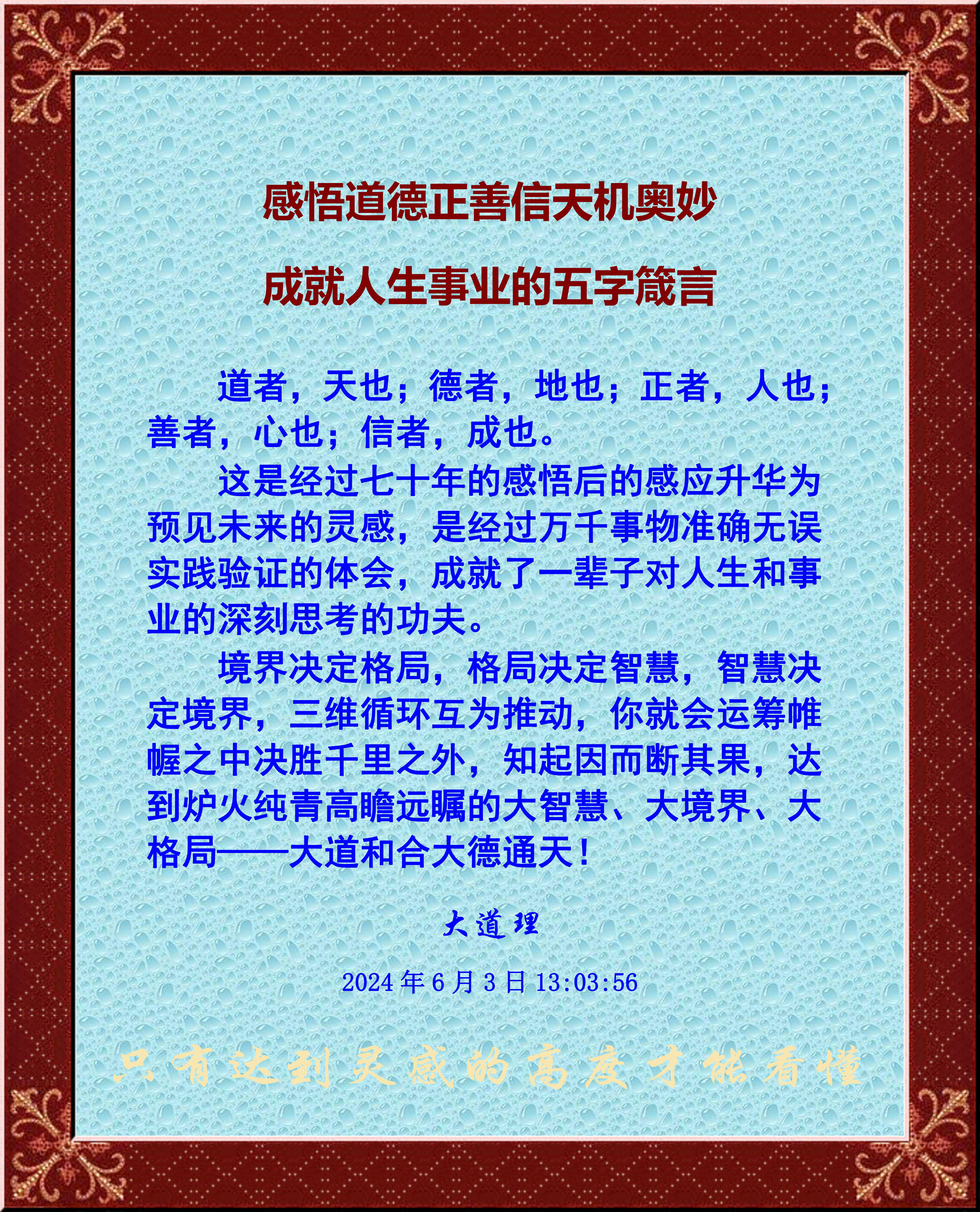 境界决定格局,格局决定智慧,智慧决定境界,三维循环互为推动,你就会运筹帷幄之中决胜千里之外,知起因而断其果,达到炉火纯青高瞻远瞩的大智慧、大境界、大格局——大道和合大德通天!