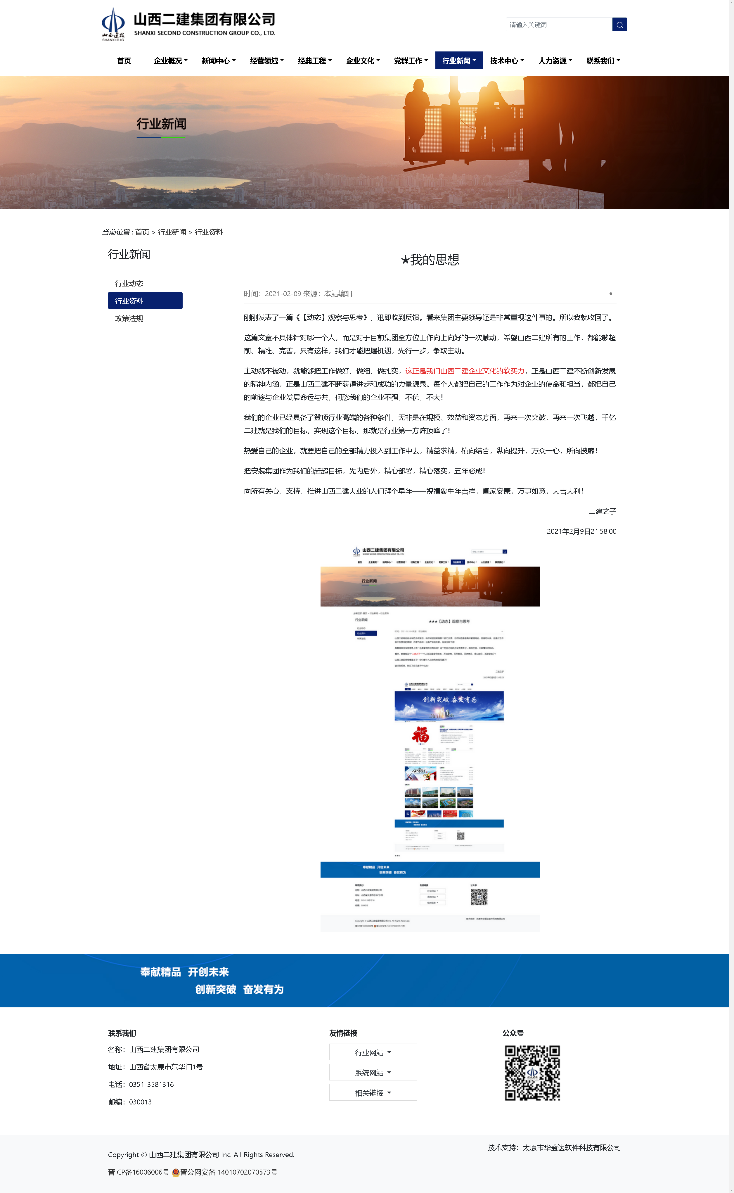主动就不被动,就能够把工作做好、做细、做扎实,这正是我们山西二建企业文化的软实力,正是山西二建不断创新发展的精神内涵,正是山西二建不断获得进步和成功的力量源泉。每个人都把自己的工作作为对企业的使命和担当,都把自己的前途与企业发展命运与共,何愁我们的企业不强,不优,不大!