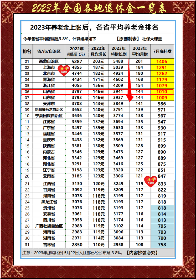 全国各地退休工资一览表——2022年31个省份平均退休金排名更新